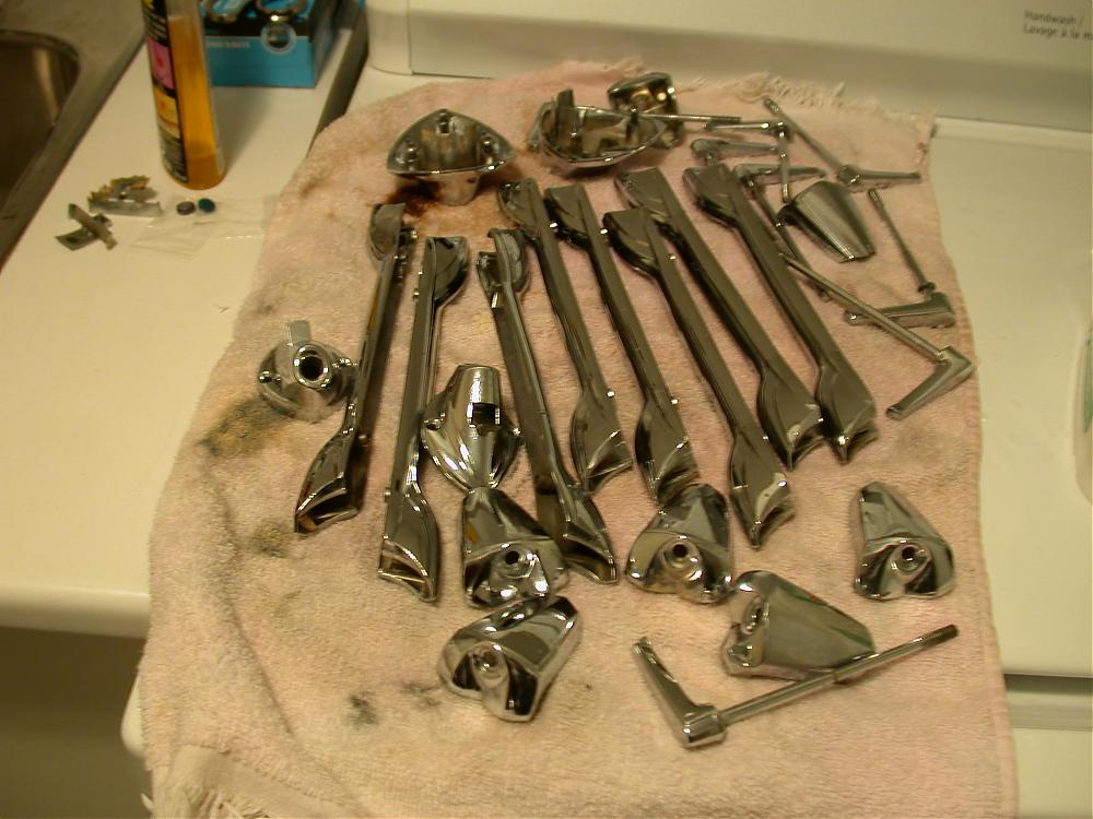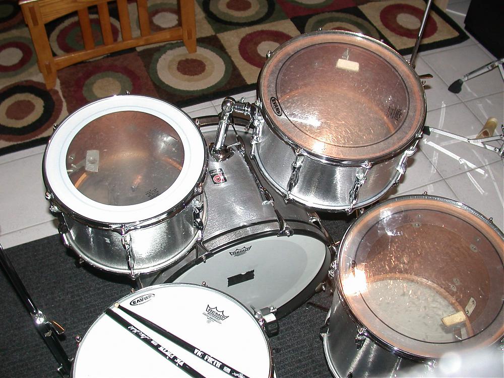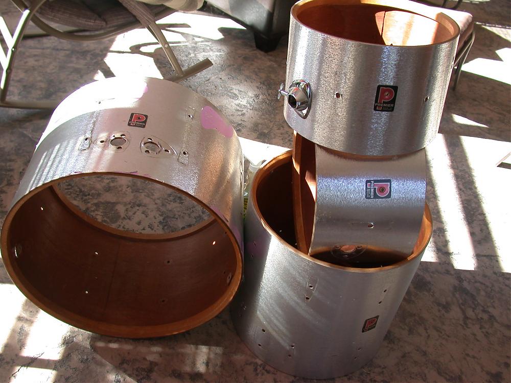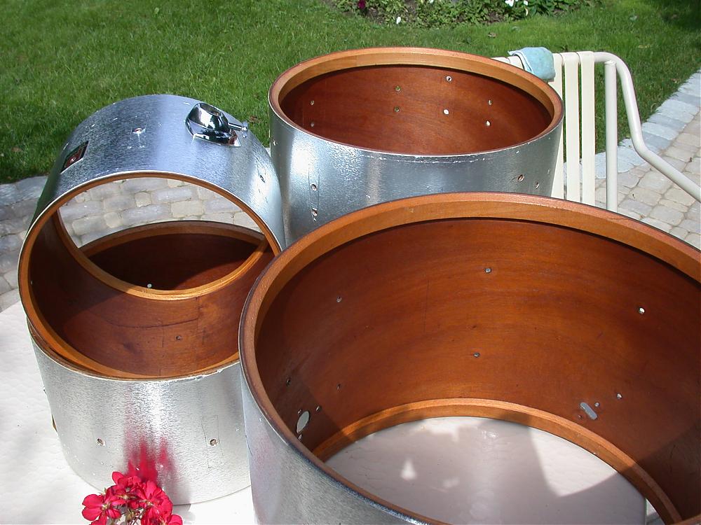 The hardware and lugs have very little pitting. It took a lot of elbow grease to clean up the chrome as it was caked with decades of cigarette smoke. I painted over some bare spots on the bass drum where the wrap had peeled, so its passable. I did not want to do a re-wrap and discovered I didn't have to after all. Bearing edges were near perfect except for the 14" tom and the bass. Some sanding did the trick though. I had one re-ring on the 14" to re-glue. The re-rings are actually Beech. All the die-cast rims are excellent. The bottom left pic is prior to clean up and Tung Oil. The Royal Ace snare is done and plays very well!