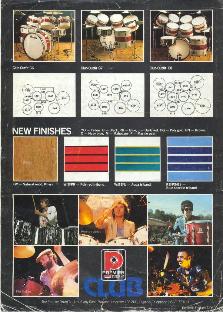 Hi Shrubby, lovely finish on those drums, I do like Premier and being British of course have seen my share of it. As far as I recall, Premier Club drums were previously the Super Olympic range (or was it the other way around - escapes me now); low down in the product spectrum but certainly not low in terms of quality of manufacture/materials used. The chrome plating is second to none. The shells probably have birch reinforcing rings top and bottom, and are otherwise thin (3 ply?). Guess they'd date from around the early 80s, standard sizes/depths. I've never seen a snare in that finish, most likely it would have been a chrome 1035 model included with the set. Bet they sound good? But if the heads are original it'll probably sound even better once you change them.