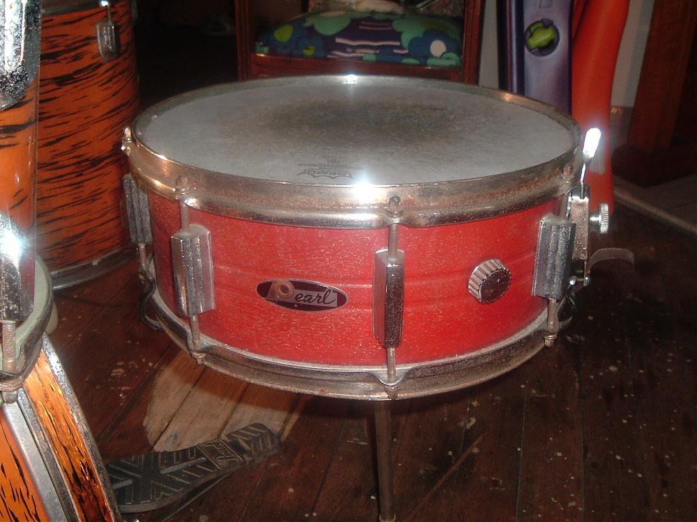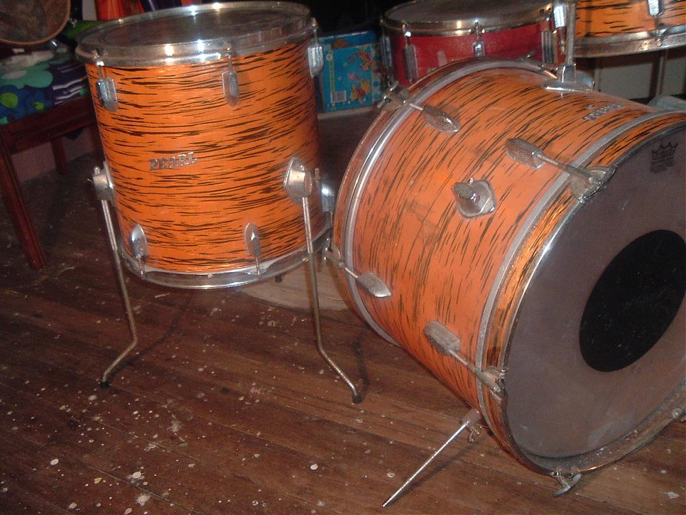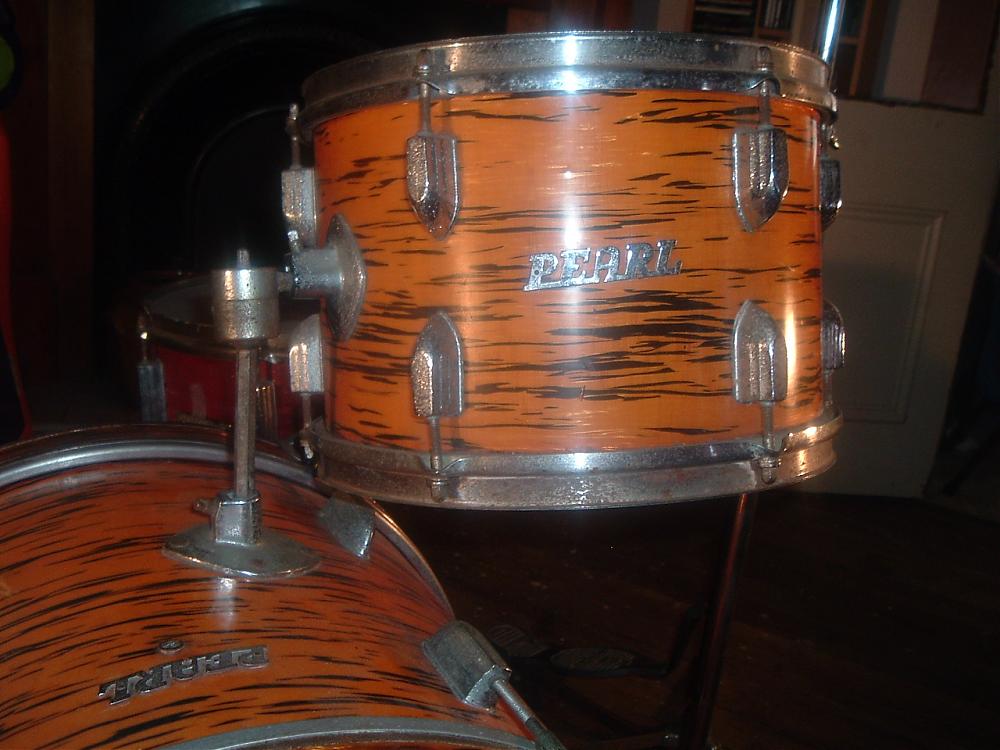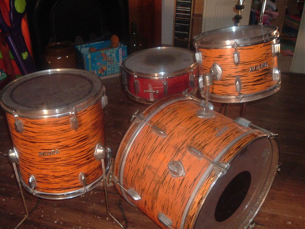 Hi Guys, I recently picked up this old Pearl kit with the intent of restoring them to their former glory. I've been doing the research and best I can figure is that they are a 1969 Challenger in gold oyster pearl. But the snare drum doesn't line up with this, it's a steel 8 lug 14x5.5. I'm thinking this could have been changed at some time in the kits life as some of the stands are from another company and the kick pedal is a later model Pearl one with an upside down spring. The drums themselves are 20x14, 12x8 and 14x14 with the silver script logo's. The photo's will tell you more than I possibly could. This is my first post by the way and I'm looking forward to searching your forums for info to help me one my restoration journey. Thanks for your help...