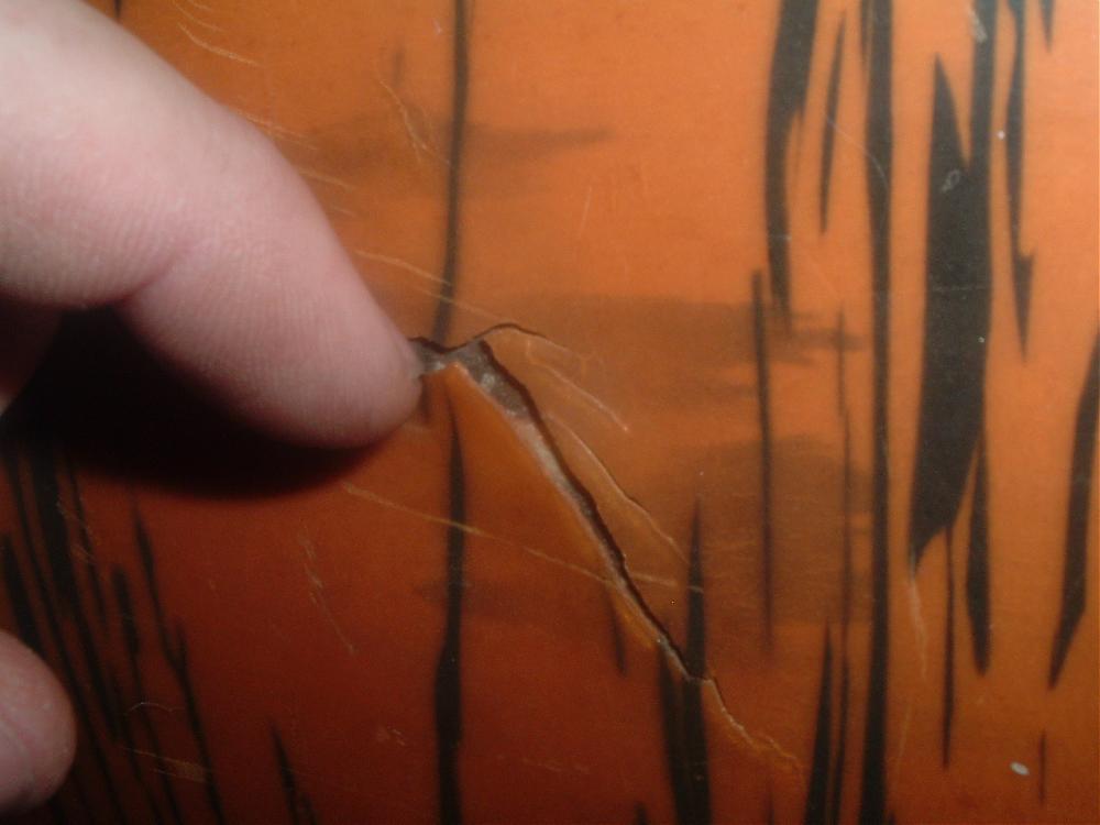 The hoops are past it I'm afraid. Also one of the inlays is gone too, there is about 20% if it missing all together, but the other one should be salvageable. The thing that concerns me most is some damage to the wrap on the bass drum, I've put in a few pics to show everyone. What is the best way to attack this? Would a repair be possible? It's going to be the worst part of the whole restoration process, no doubt. I love your kit too Fayray, it's sweet. There's one on eBay at the moment very similar only in gold oyster. It's a 5 hour drive to pick it up but I'm thinking about it. ha ha...