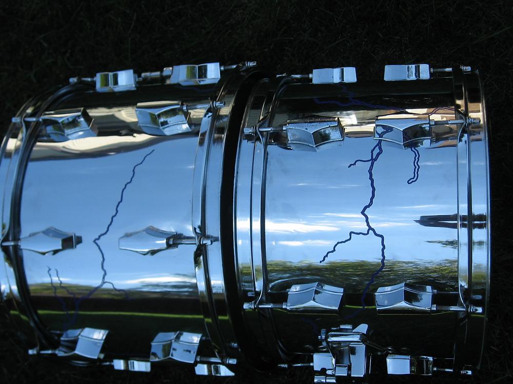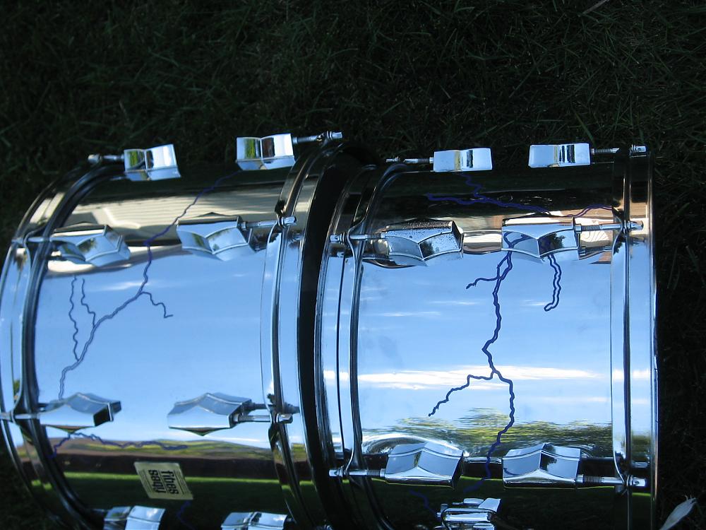 Since the theme of my band reflects high voltage, electricity, I thought lightening bolts would be fitting. I had contacted several graphic shops near me and all of them said they could not get the details on vinyl in a way that would look realistic. When I was at the Chicago Drum Show, I stopped by the Maxheads booth, who specialize in drum head graphics. I might add that what I saw in their booth was amazing. I talked to Dave the owner about my idea, and as luck would have it, his shop was not far from my work. He liked my idea, and said he could come up with something that would reflect the look I was trying to achieve. So I made an appointment and meet his designer and went over colors, and I shared with him some pics of lightning I liked, he said to come back in a few days to look at samples. When I came back I could not believe the detail in the graphics, since my drum is chrome, I didn’t want something too overpowering to compete with the chrome, but still noticeable on stage. We decided purple in non reflective material looked the best; here is a pic of the bass drum. I brought it to a gig over the weekend and people noticed, and all comments were positive, if you are looking for any kind of graphics for your drums, these guys can do it, and get it right. Check them out on the web at www.maxheads.com for samples and info on all the other promotional materials they offer.