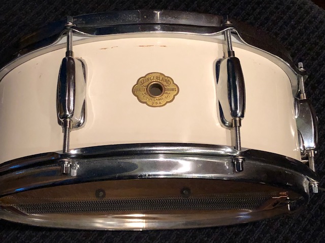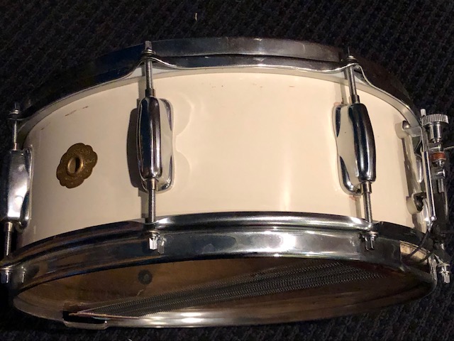 What I have here is a Slingerland Radio King re-issue made in 1995, post Niles era. I'd played so many gigs with my 6.5" deep metal Slingerland snare that I bought with the kit in 1980 and was a little tired of it so when I visited my favorite drum shop of the day (J.C's, Detroit area) and he had one of these I bought it and used it for 10 years of gigs. Love this drum, fat and warm and articulate and decidedly not metal sounding. For the money it cost, the throw-off is not a premium bit of hardware but it's functional. The white finish is a lacquer and I've managed to chip some off over time but the thing that makes the drum is the one-piece shell. Plus it matched my plain white rest of the kit albeit not as yellowed as the wrapped drums. And now that I've taken some pics I see that it could use a tear-down and reconditioning but i'll get to that soon.