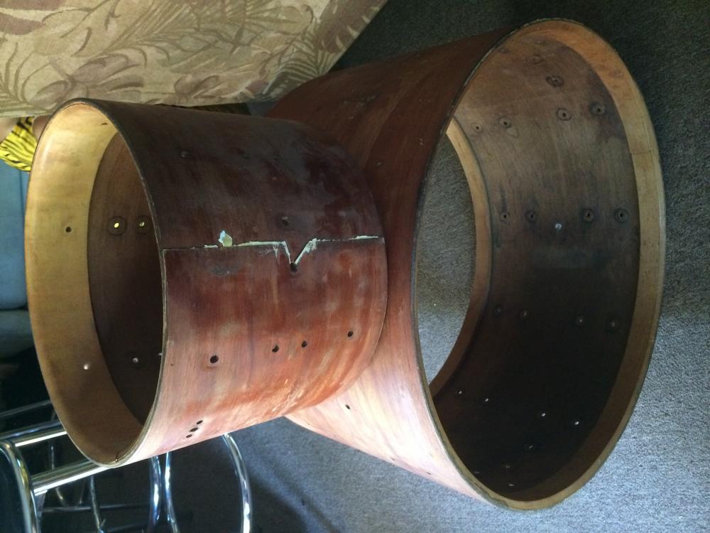 24x14 and 9x13 shells with badge. Only two extra holes on the bass drum right where the mount is. I dont know why, but its right next to it. Theres also a crack but its just the outer ply and its where the mount is. 150 for both.