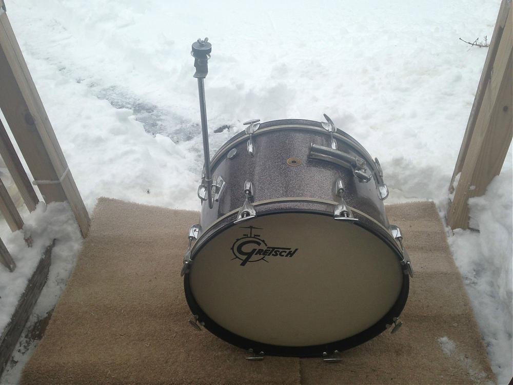 - a 14" x 22" bass drum in excellent shape with original cymbal L arm and front logo head