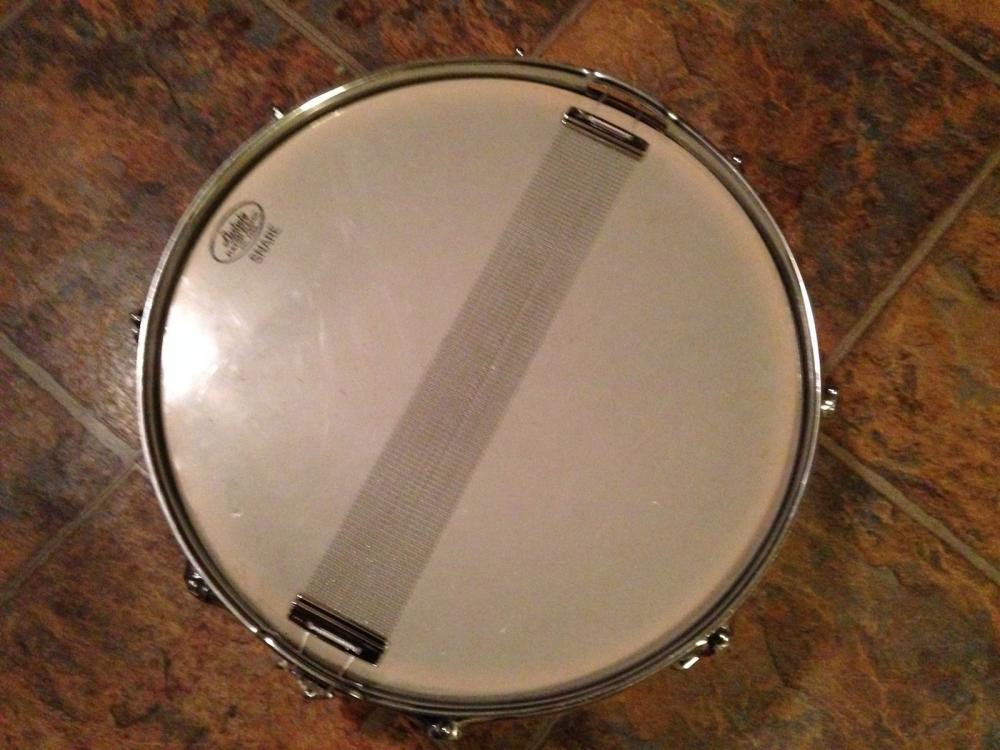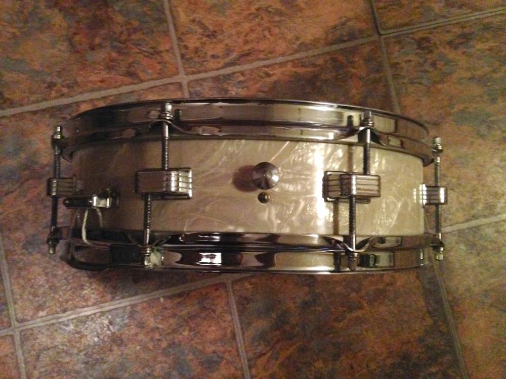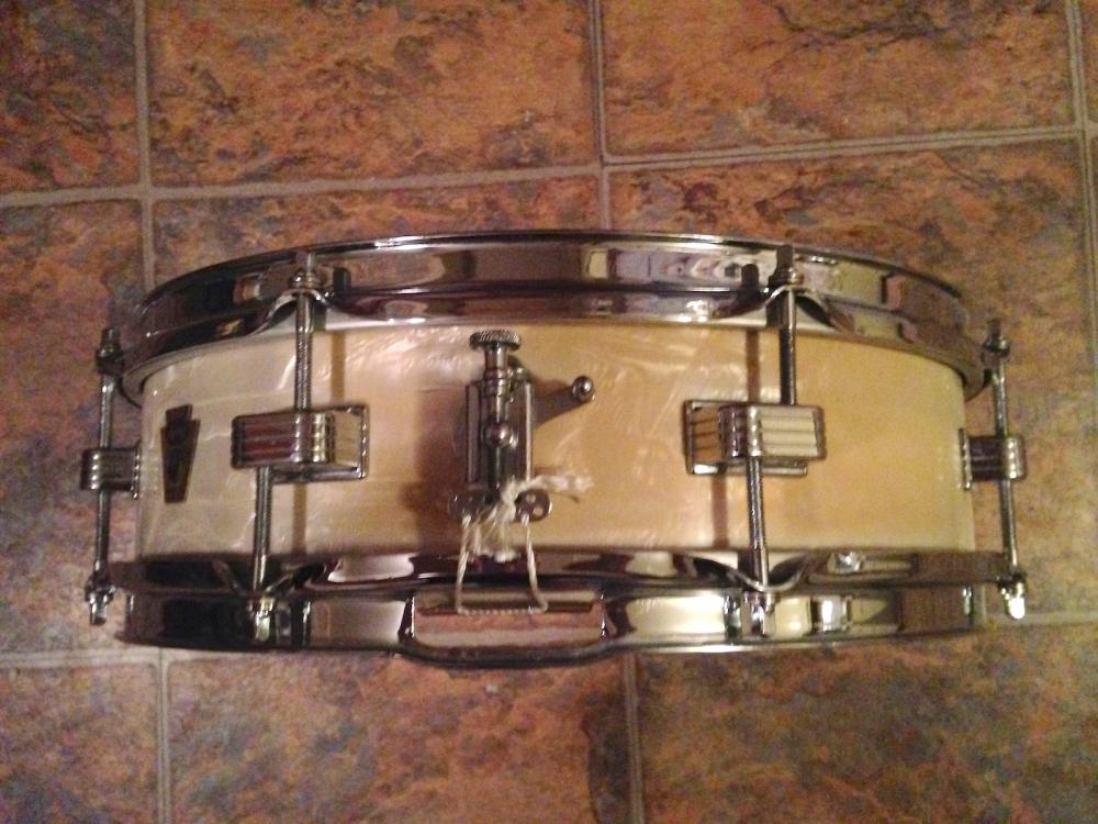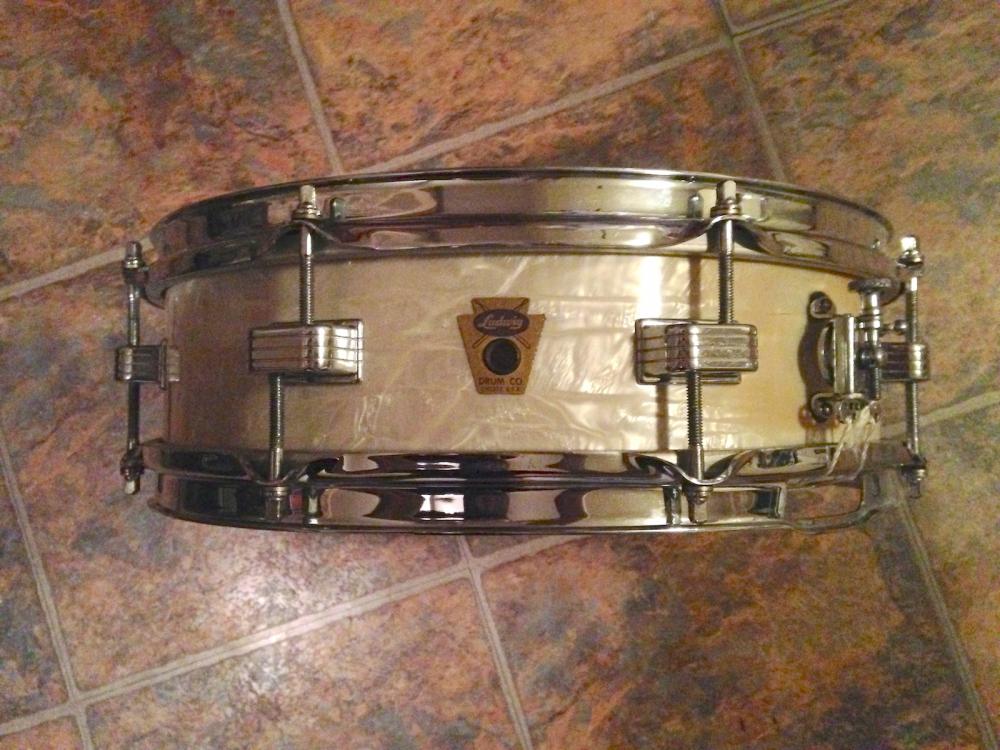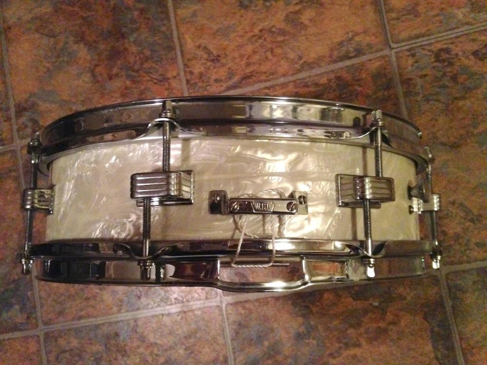 Rare Vintage Ludwig late 50’s / Early 60’s Transitional Badge ‘Downbeat’ model 4” x 14” snare drum in original white marine pearl wrap finish!