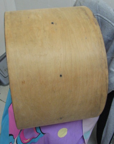 I recently aquired an old tenor drum that had at some point had had an attempt to remove all it's blue enamel paint made upon it. With thoughts of producing a natural wood grain finish I've been sanding the surface with 120 grit which has removed the vast bulk of the left over paint and removed the deep scratches that had been made in the drum. There are still little spots, mainly low spots that have little bits of the enamel in them and sanding sems to just "burn" them in. I do regret sanding the drum because it has removed the ageing colouration, but I hope to restore that with a stain.