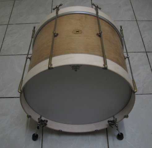 It has 30's single tension Ludwig & Ludwig hardware that looks like Ludwigold, and the spurs are 30's Leedy but Ludwig had exactly the same ones, so it's fairly period correct re the components albeit 12x18 bebop size bass drums were pretty much unheard of then as far as I know.