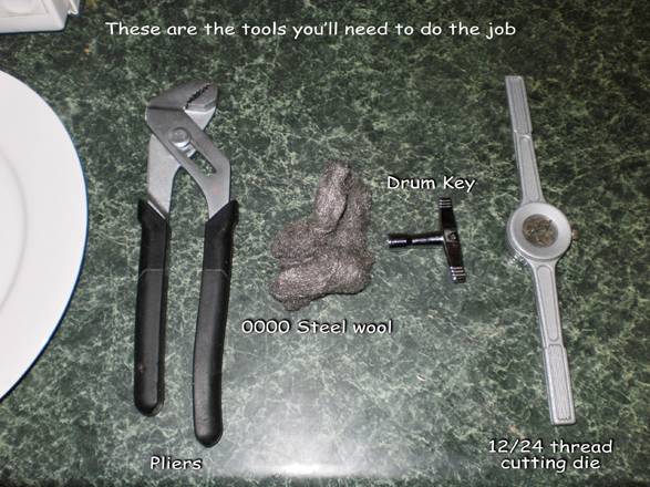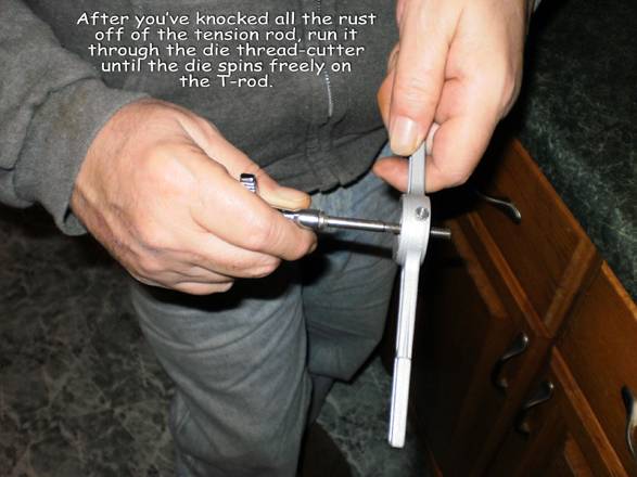 5. Using a 12/24 thread cutting die, (see photo) wind/chase the length of the tension rod threaded portion through the die. The threads will be dressed and they will thread smooth as silk into any lug. Run the rods through the die until the die spins freely on the tension rod. Takes a little work, but it makes rusty old tension rods look and work like new.