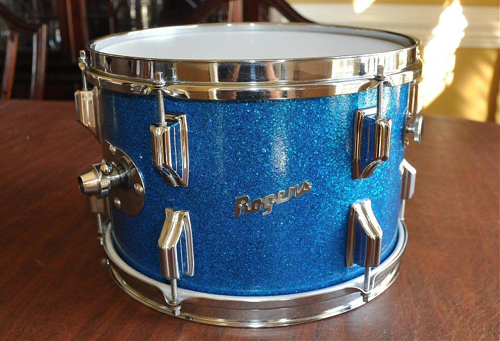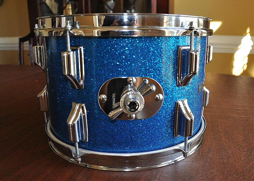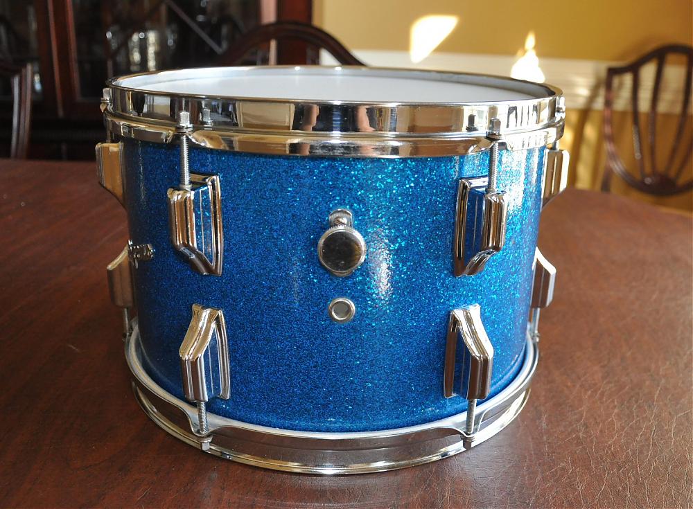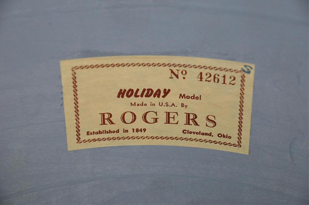 This is an all original 1964 Rogers Holiday tom in Blue Sparkle. The shell is in round, with excellent bearing edges. The reinforcement rings are also in excellent shape showing no separation. It has a flat gray interior and a Cleveland tag with serial number 42612.