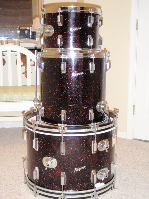The set includes the drums & the mounting hardware for the tom & the cymbals & the spurs (the snare is not included). All the collets are machined. There are tall hoops on the 13" tom & standard heigth hoops on the floor tom. The bass drum hoops were repainted and silver sparkle inlay installed by Jack Lawton. The bass drum has the faucet handle t rods & claws. The lugs are the heavier Cleveland version. The chrome is in very good condition.