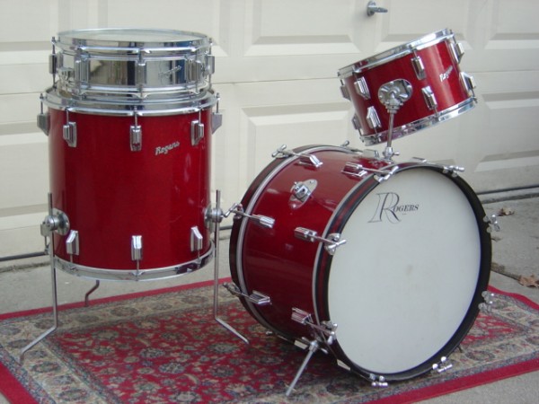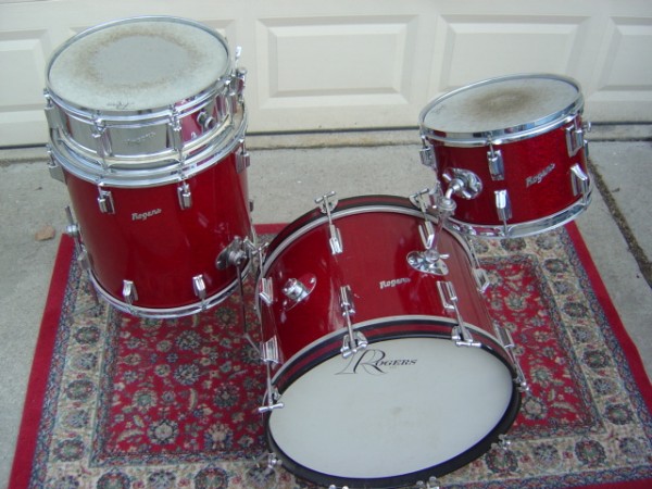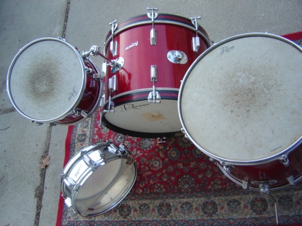 Red Sparkle 14X20 Bass Drum, 8X12 Swivo-Mounted Tom, 16X16 Floor Tom and 5 X14 Power Tone snare.