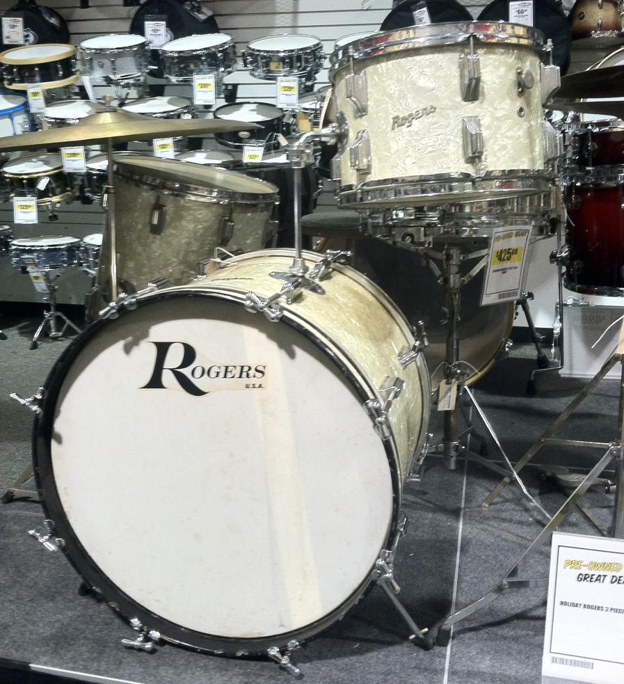 I just started at Sam Ash last week. When I came in on my first day of training this kit was set up in the back. This set was owned by one gentleman until it was brought in to SA. The heads, with the exception of the resonant rack tom head, are Rogers factory heads. Overall the hardware would benefit from a thorough cleaning, but the shells look immaculate and are in excellent condition. The shells are 5ply mpmpm. The tag on the Tom reads Holiday Model, Cleveland Ohio, and is stamped with the number 46982. This leads me to believe the kit is from 1964.