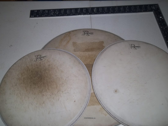 12", 13", and 16" used "Rogers USA" heads. Dirty, but usable. Not beat up real bad. The 16 has duct tape residue.