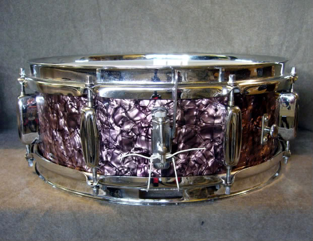 THe finish is purple diamond pearl. It is a hard to find finish. There was a limited run of PDP and it was never offered in a catalogue. This particular version is an early holiday with an Eagle badge, which is why you see the earlier strainer. The early ones used the larger b&b (bass drum sized) lugs. The lugs were pretty much shot and I have since put Petty replacements on the drum. I will probably switch the replacements to a bit later 6.5x14 WMP Holiday I have as I can't wait to hear that drum sing.