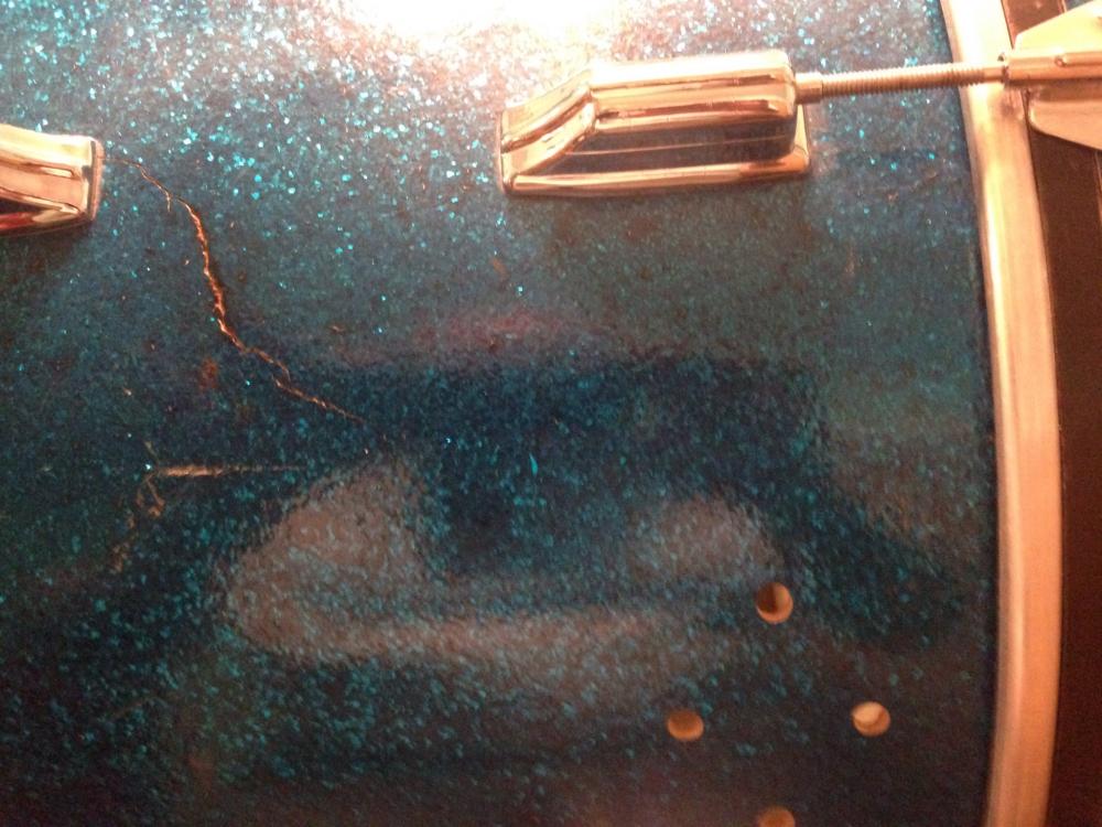 That said, I'm confused about the bass drum. Was it originally special ordered without telescoping spurs? And what massive rectangular part was mounted to the top that would cause discoloration, yet required no additional holes to be drilled? Or perhaps it was a sticker or something to cover up the stock holes...