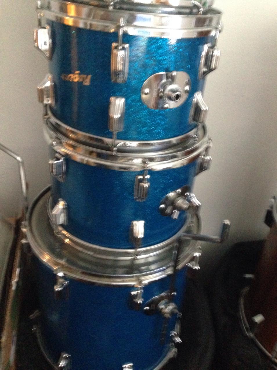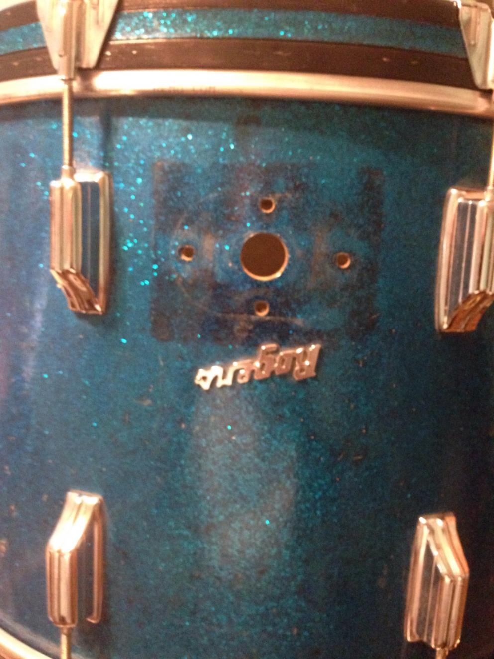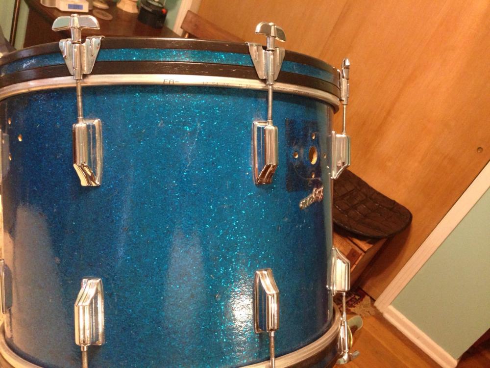 I'm thinking about buying this blue glass glitter Rogers. It has the script badge and I believe they are Fullerton era. The toms are in good condition and original, but the kick was modified with fold out spurs, making four extra holes on each side. It has a 13,16,20. He's asking $600, thanks.