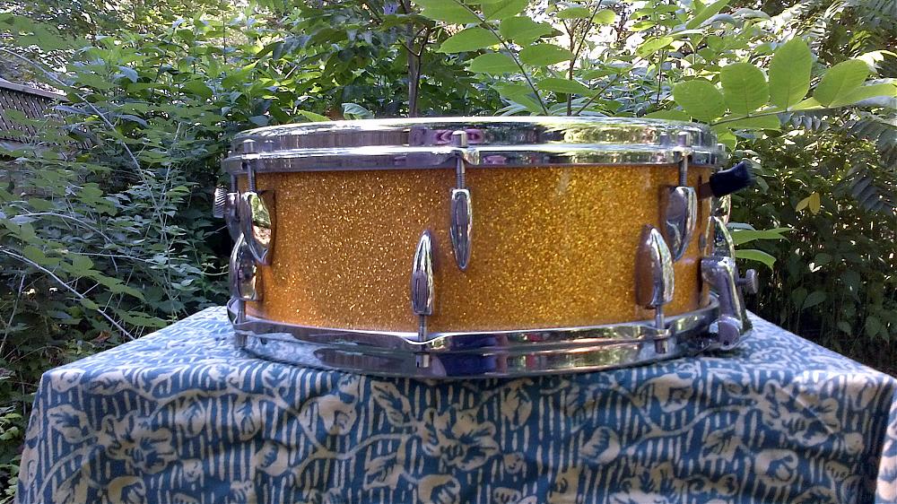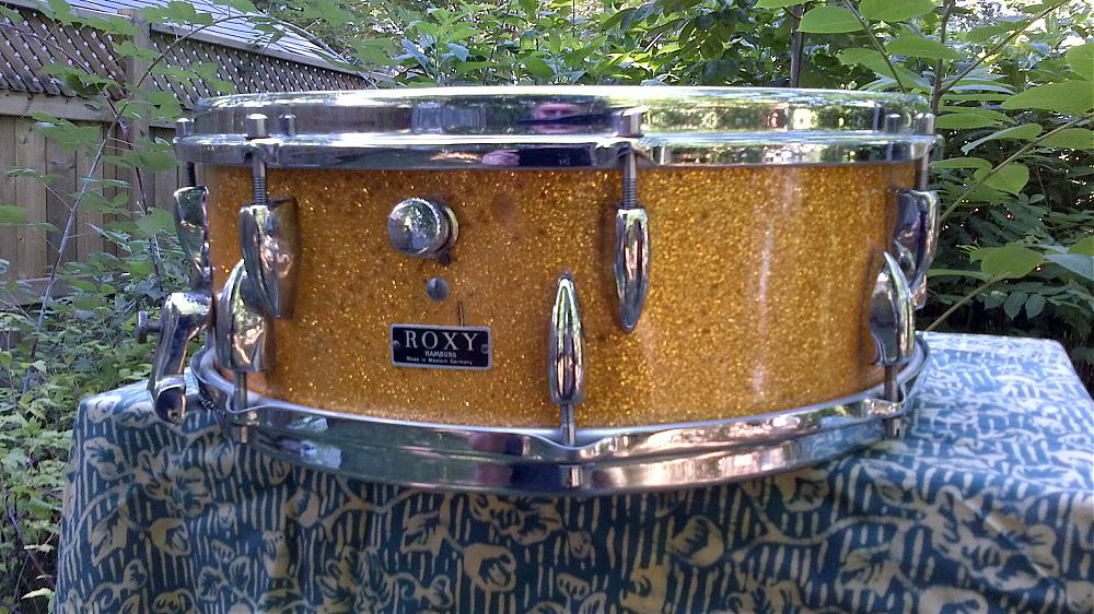 This one is part of a 5 piece kit from 1959. It is the high end snare for its time made in the Tromsa factory, badged Roxy for Rudolf Linnek's export business. Almost all Tromsa drums ending up in N.A. were badged Roxy. The Gold Sparkle wrap on this is extremely fine grained and glossy and is a little more yellow than the pictures show. I have only ever seen Trixon drums with the same wrap. It is 14x5,16 individual lugs. The wires are original 12 strand carbon steel. Three ply Poplar shell with two ply beech rerings. Tromsa used this shell formulation for snaredrums for at least 30 years.