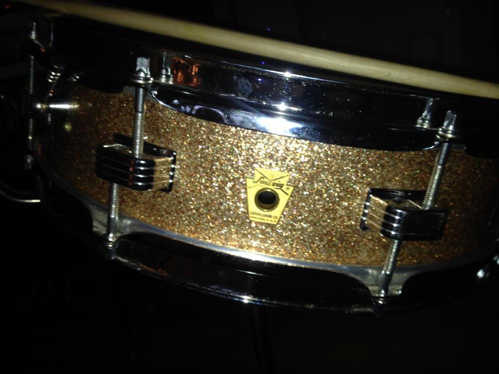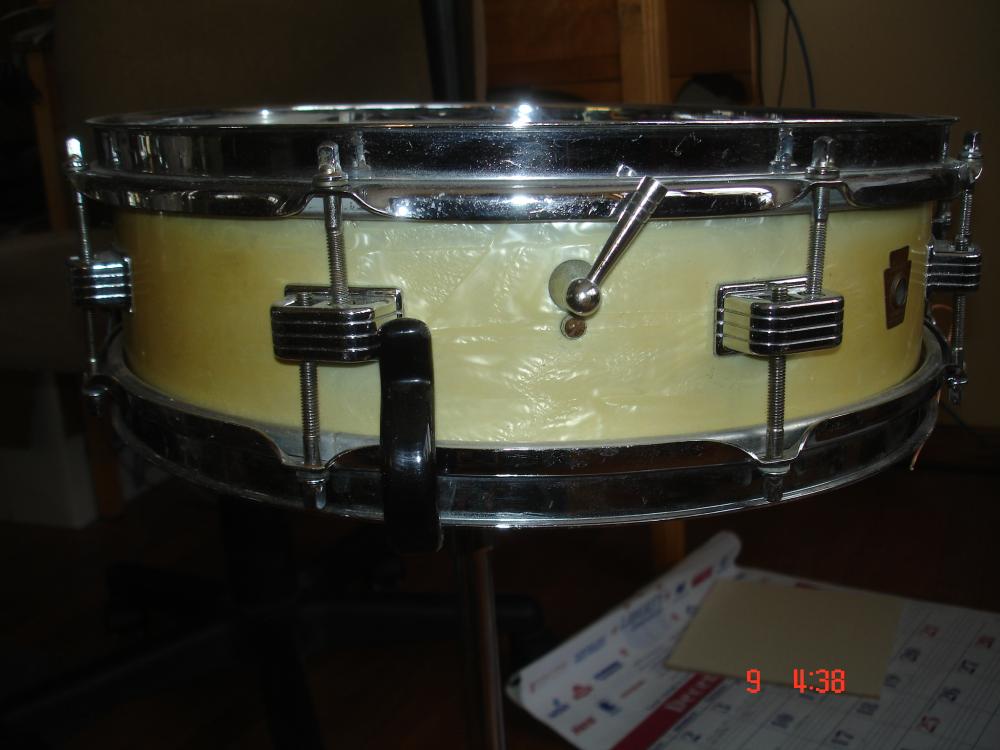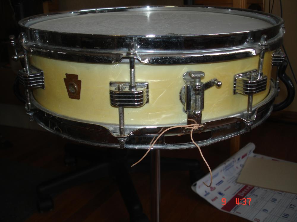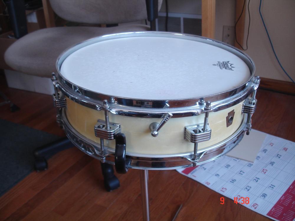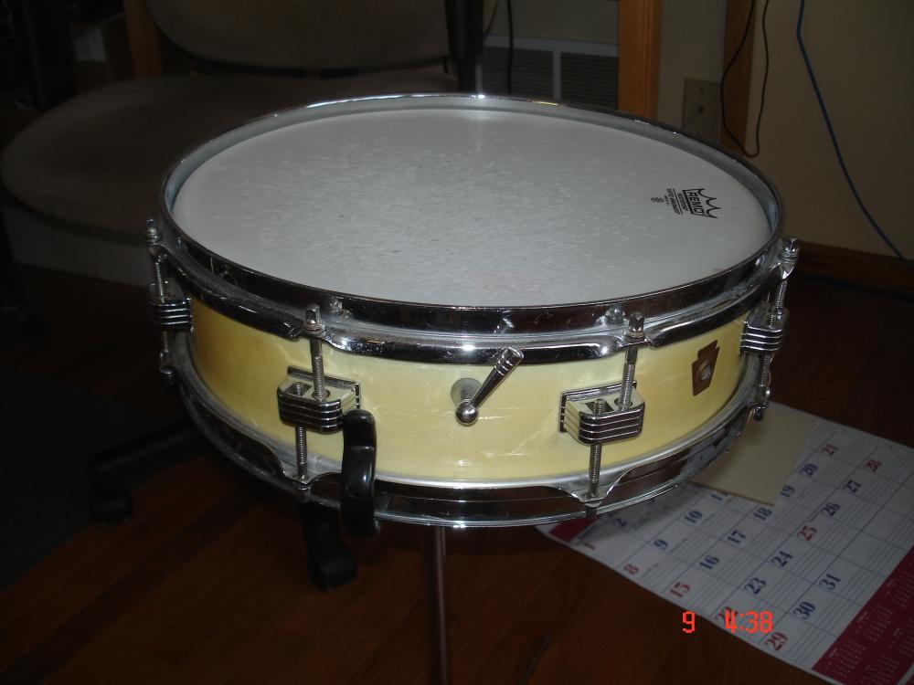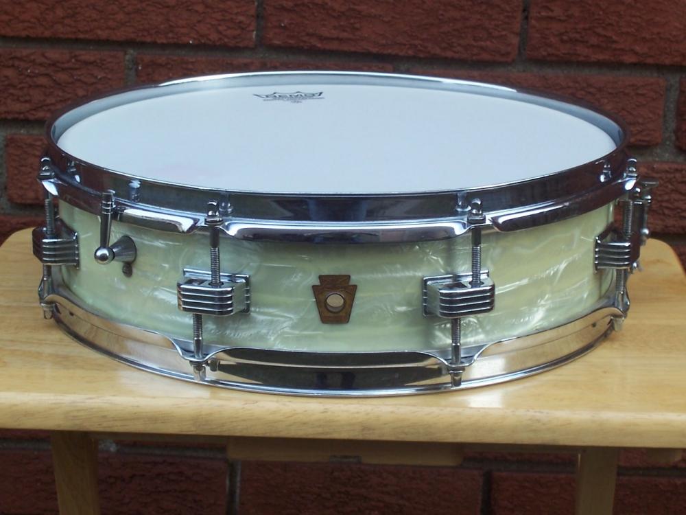 But in 1960, the 4 x 14 you see pictured above reappeared in the Ludwig catalogs. Called the Downbeat model, this little cupcake delivered " the goods." In production until 1970, the Downbeat was surprisingly versatile despite its smaller size. The wood shell was composed of a 3 ply mahogany/poplar/mahogany mix. At the same time, the 3 x 13 reappeared as the Jazz Combo model. This model lasted until 1970 when it was replaced by the Ludwig Piccolo Drum ( See blog dated Nov. 30th).