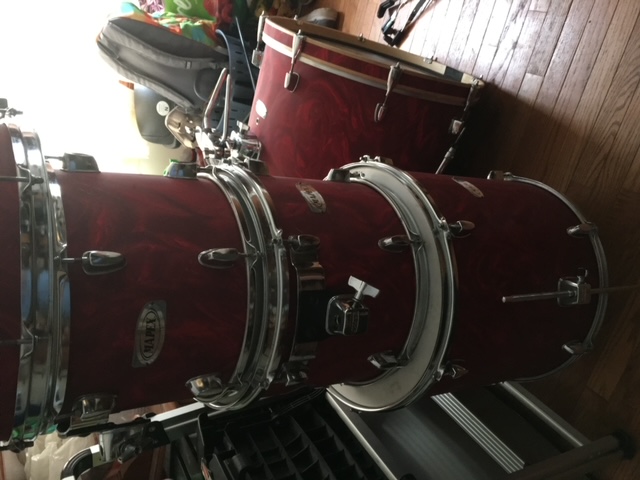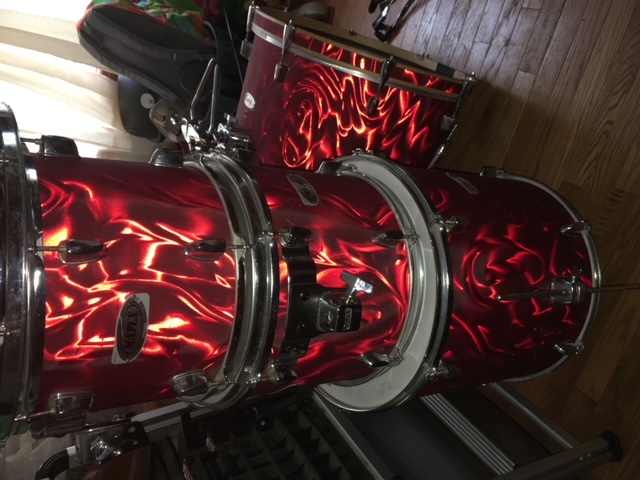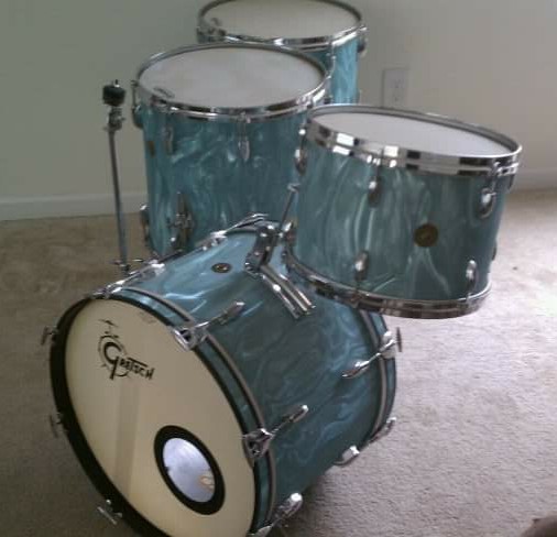 These were my rewrapped Gretsch set. Original 3 piece (13/16/20) with Pearl style mount holes in the tom & bass. The original wrap on all was cracked or missing. Added the 2nd 16 and the 6 lug snare. Both needed a lot of love. Filled the holes & rewrapped them all to match. Sold them to a guy in Jacksonville. FL in 2013, with him knowing they were rewrapped. Amazingly, everything was there for all of the drums, except the bass badge and a couple of dampeners that I bought from Cherie Willoughby way back at the turn of the century. They were really a great set of drums. The snare is not in the photo.