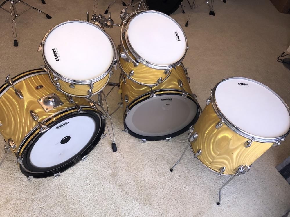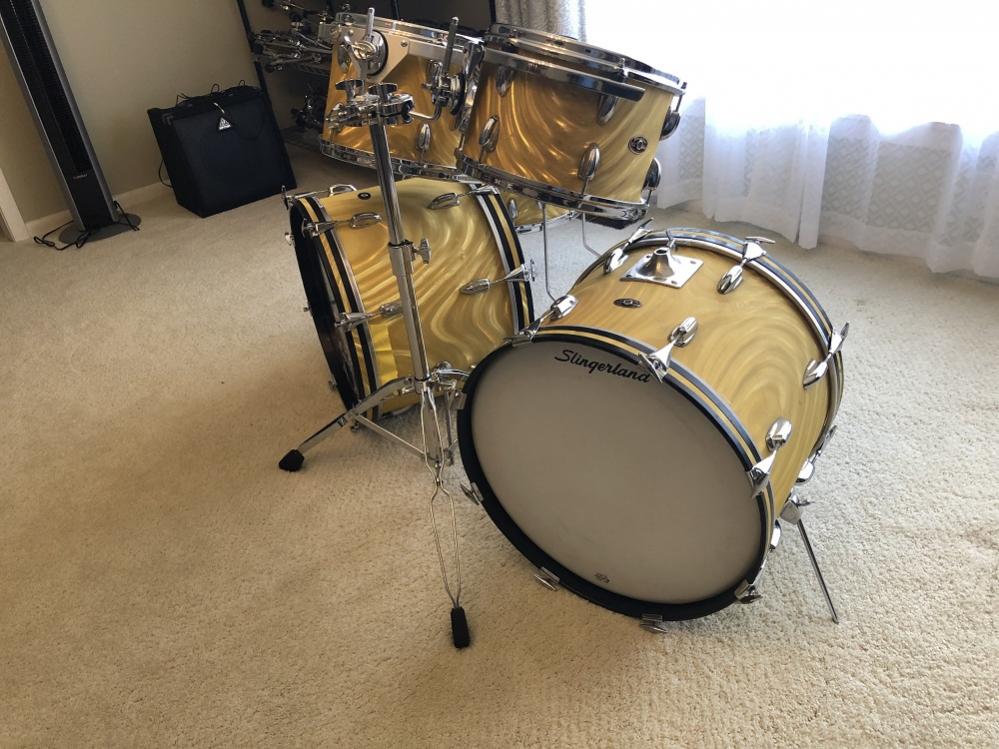 I have a 1966 Slingerland Yellow Satin Flame double bass. But I've realized I can't play double bass, so I have it up for sale on Reverb.