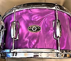 The 1961 Slingerland 7 x 14 snare drum that i acquired with my 1968 Lavender Satin Flame set had been repainted in black lacquer. I bought the closest match to the original satin flame wrap material from Canal Plastics in New York City. It's fairly close to the other drums. It was easy to wrap over the painted shell. Here it is after I installed the badge that is original to the drum.