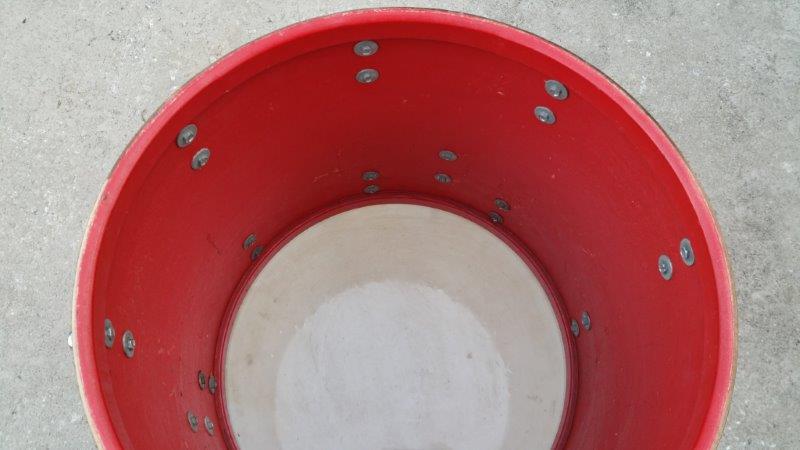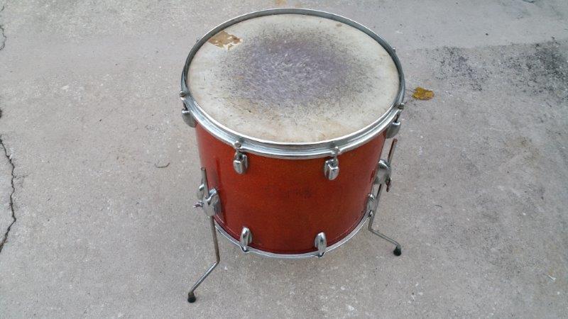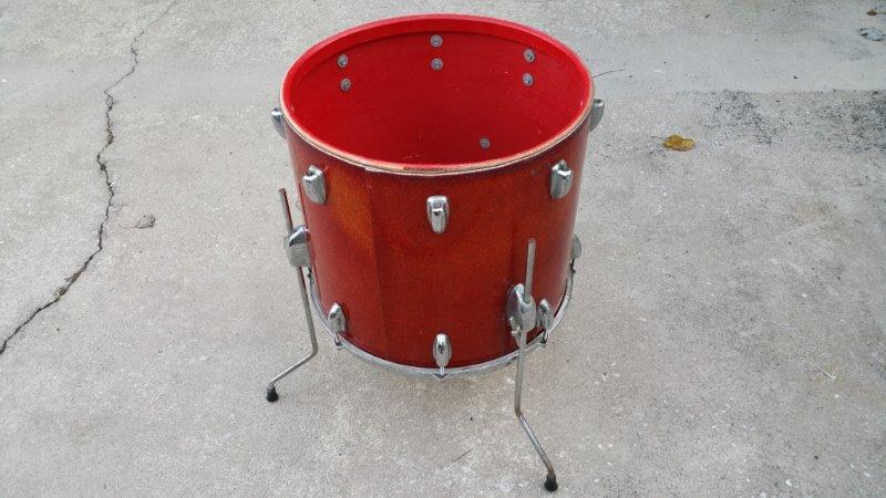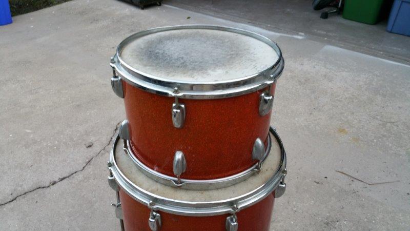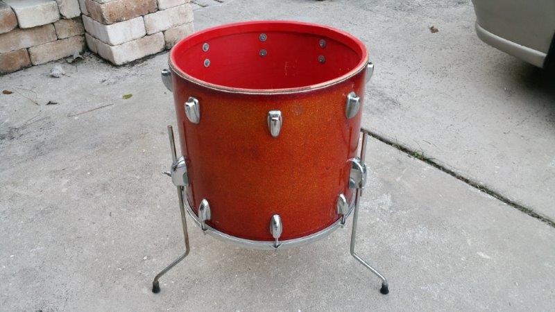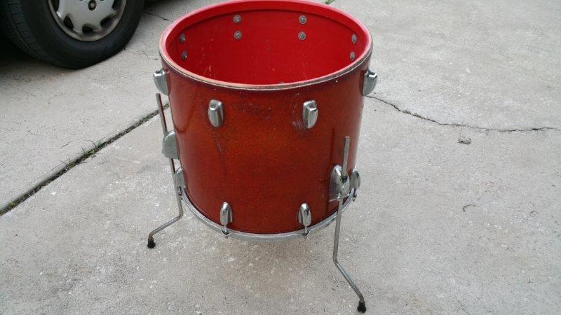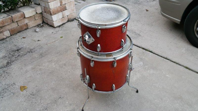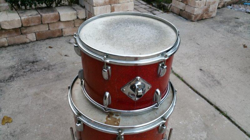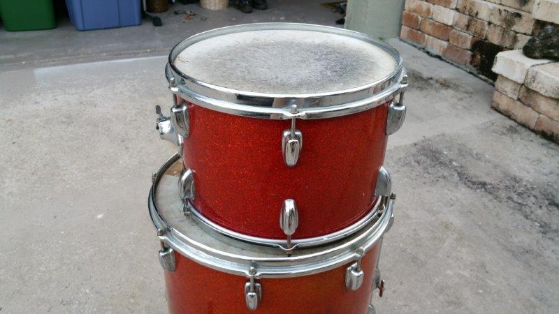 Exteriors are original faded red sparkle. I think a previous owner may have painted the interiors red for some reason. I believe these are 50's shells. The floor tom legs and the mount on the 13 were switched to more modern ones at some point.