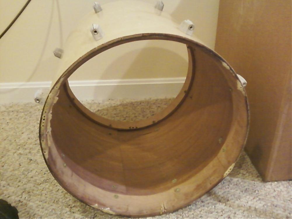 Anyway, there is a little bit of 'egg' on one end of the drum. I put some glue on the open seam, and put a form inside it to round it back out. I was able to get a head and rim on there easily. However, since I didn't leave a head on it, it has 'egged' a little again.