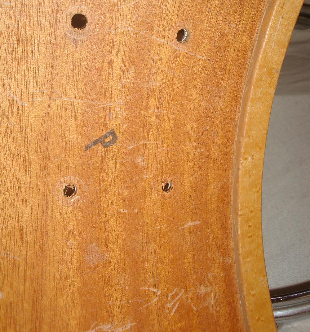 The batter side hoop has a snare side like grooved where a wielded metal part acts as a BD pedal receiver. (looks factory)