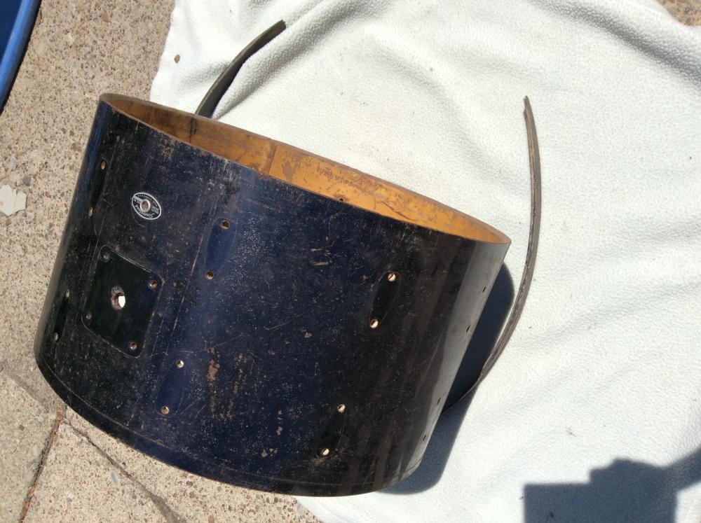 I have for sale this 14x24 five ply black chrome over wood slingerland bass drum shell with no hardware. I have one hoop that is unglued. As you can see from the photos it is in rough shape but I think it is salvageable. $25/bo. I can't imagine it is worth shipping but if you pay for it we can do that.
