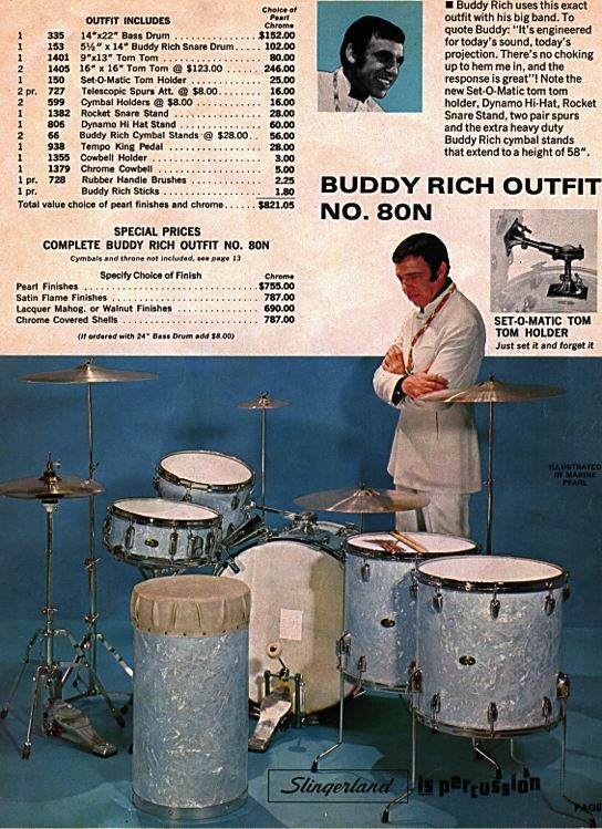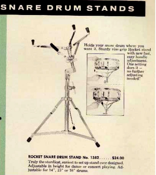 Through Buddy's Slingerland endorsement he used the 1st type Buddy Rich cymbal stands with the "small" base ... same base as the Rocket snare drum stand actually. Slingerland went over to a WIDE base stand in the later 70's, but Buddy didn't use them with his regular gig to gig Slingerland BR 80N. Here are a couple pics for you, and a quick scan of the Slingerland "Rocket" snare drum stand that Buddy used throughout his Slingerland endorsement ...