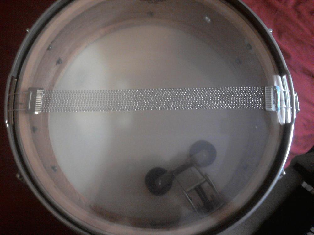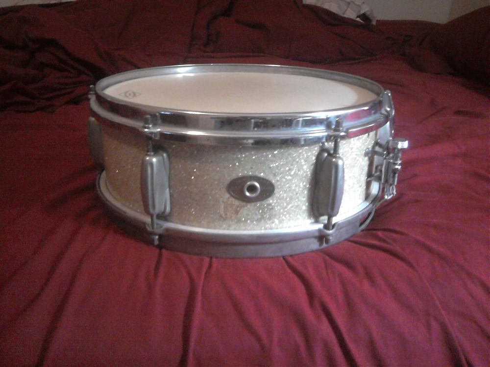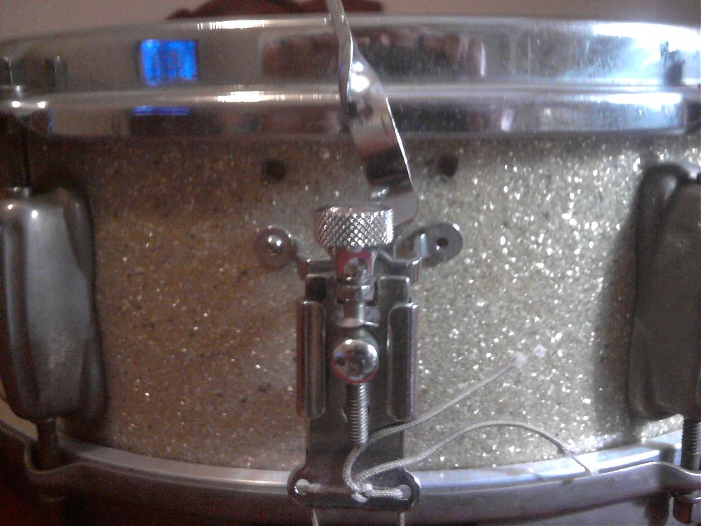 4.5x13 Slingerland Bop Snare 3ply mahogany interior. Stamped brass Chicago badge '53-'56. Original silver sparkle wrap, there is a weird spot below the badge where the wrap was damaged (melted maybe or something corrosive got on it), otherwise the seam is tight. There is some minor ply separation. 3 small extra holes where someone moved the 3point strainer up or down slightly, I'm not sure which is the original location. Lugs and bottom rim are nickel, top rim is chrome. Unoriginal wires and probably tension rods. Real nice sounding bop snare, a good player for someone wanting a Slingy in this rare size. SOLD