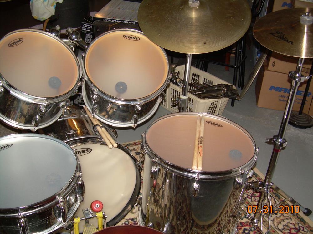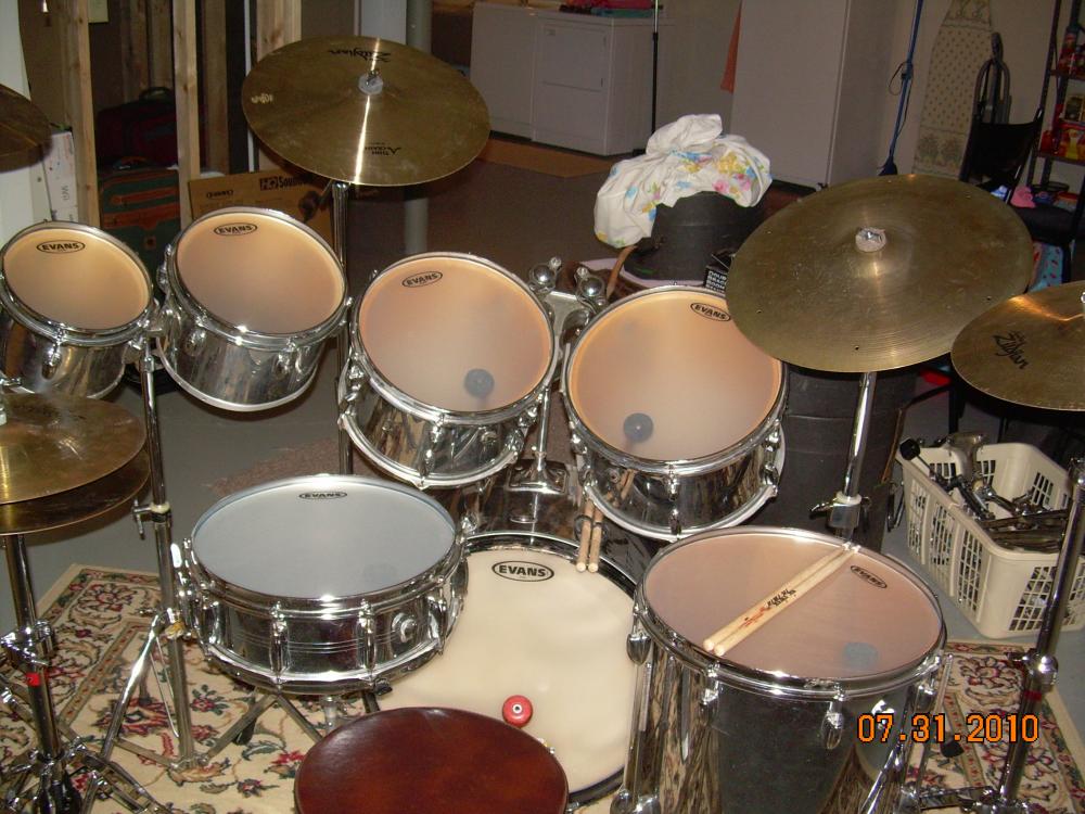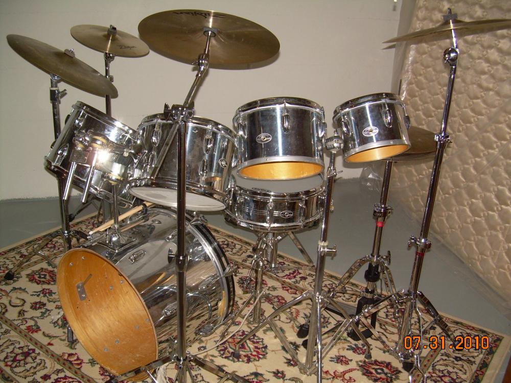 The drums are: 8, 10, 12, 13, 14, 15, 16 inch floor tom and a 20 inch bass drum. The snare is 14x5. I'll have to get better close up pictures as these were just taken at the last minute after I put new heads on them. The 14 and 15 inch toms are not shown-I just didn't have them up at the time. I still use these today-nothing like the sound of Slingerland drums to me. They have always sounded great in the studio and out live. Love the deep rich tone these drums have. Wouldn't trade them for anything. I know others would disagree-but that's cool. Thought I'd share them with everyone. Please post comments on them. I'd like to hear from you.