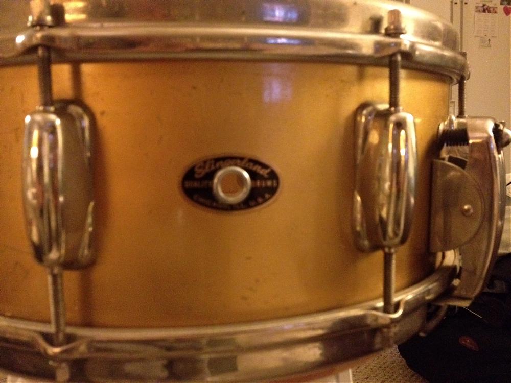 I just picked up this '56-'59 Super Gene Krupa snare (scrolled "S" Chicago badge) and the finish has me puzzled. It doesn't look repainted but it's gold lacquer. Was this a stock Slingerland finish?
