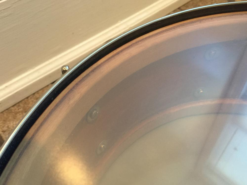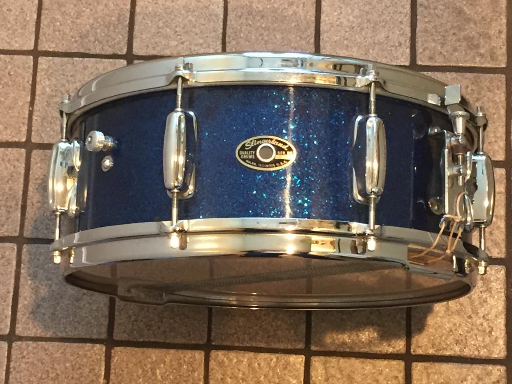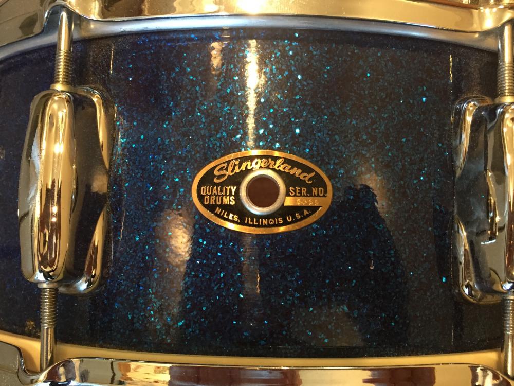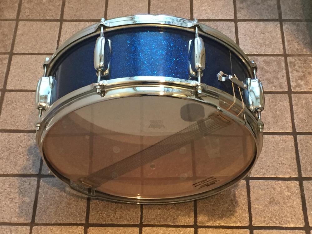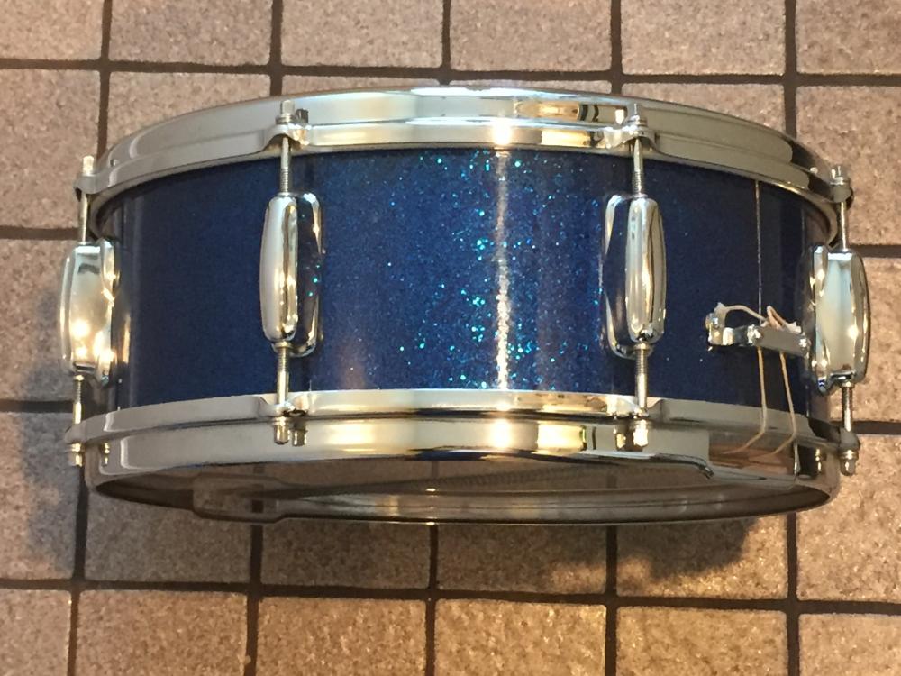 What a find! This classic vintage drum is in collectors' condition. Features a three-ply, 5.5x14 mahogany/maple shell, eight lugs, blue glass glitter wrap, Rapid throw, brass hoops -- all original and stunning. Includes the original canvas drum bag, too.