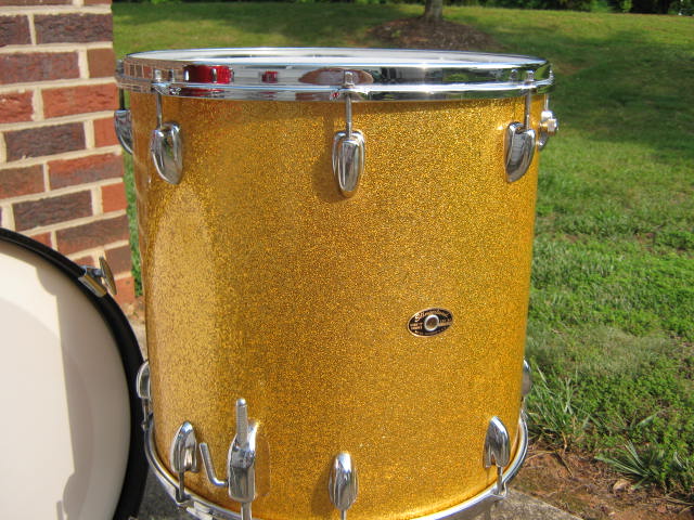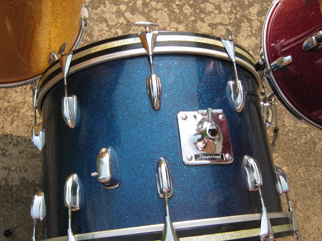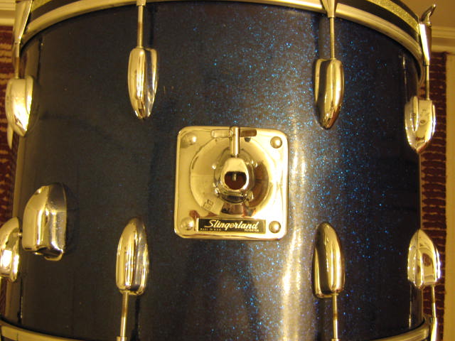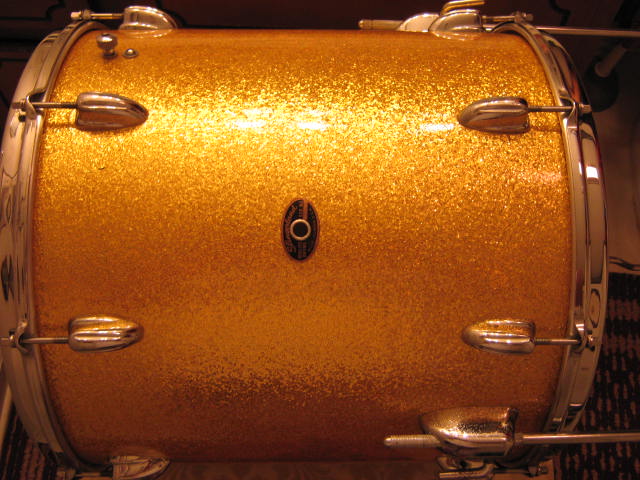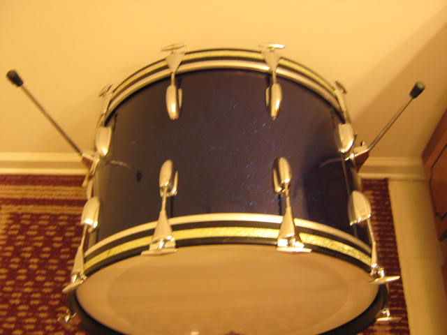 There is an unfortunate addition of a set-o-matic mount on the bass drum where the badge should go. I believe this was a virgin bass, as there are no holes for a consolette. I left the mount for you, no post. The hoops are Slingerland, but obviously the inlays don't match the finish of the bass. The bass legs are 5/16th diameter stainless replacements I had made... no points.