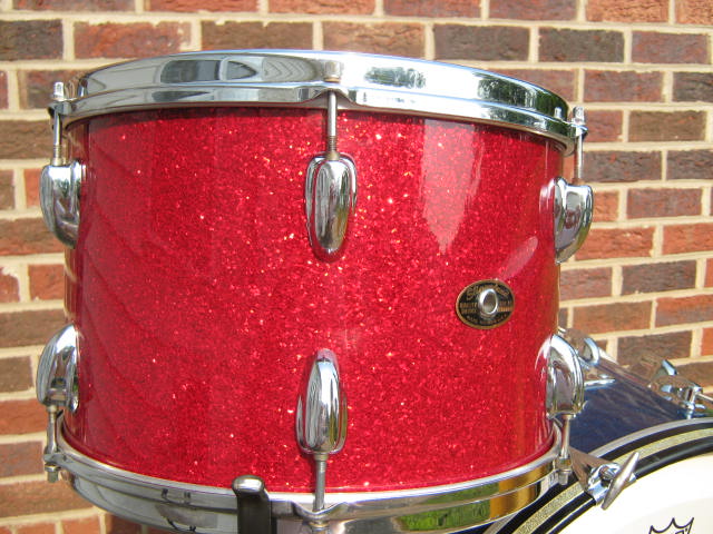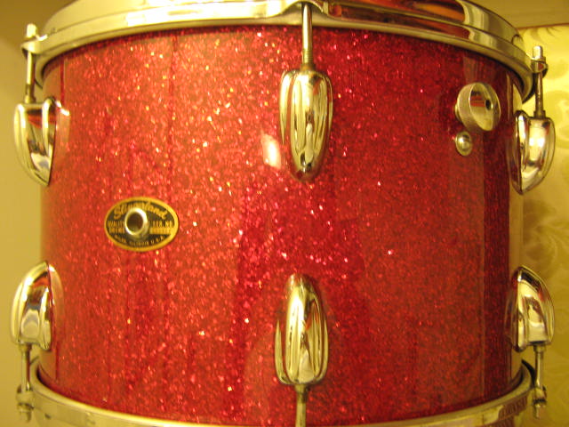 The ride is a re-wrap with Drummaker's Red Glass Glitter, which is a great match to the sixties Slingerland wrap.... I have some side-by-side pics of one of my 60s floor toms and you can't tell the diff.