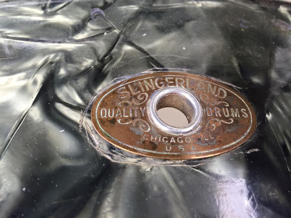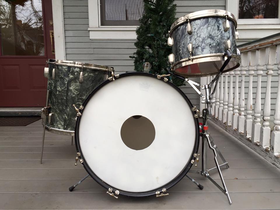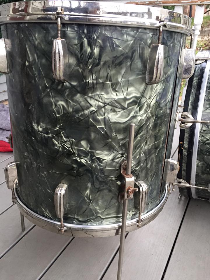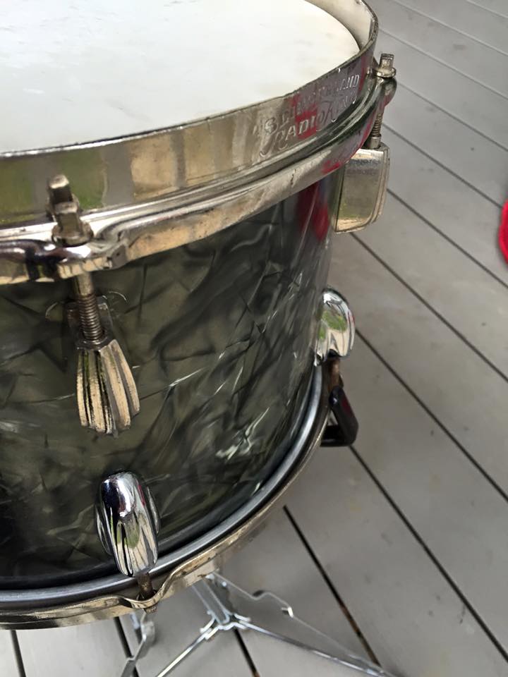 Up for sale is a late fifties RK set, sizes 20x14, 12x8, and 16x16. These are factory matched, owned originally by jazz drummer George Baron. This is a players kit - despite only have one small hole in the form of a tack in the top of the bass drum. Comes with engraved hoops on the 16 and 12, beavertail lugs all around minus 2 sound King lugs on the 12 which I used to replace 2 of the original beavertails which were broken. Seam on 16 is a bit loose, some contact cement will fix it right up. Consolette needs a part of two - I may be able to track them down for you.