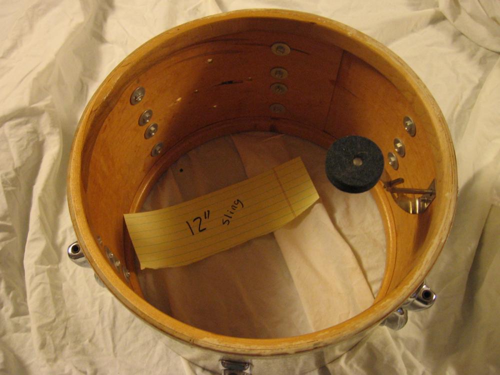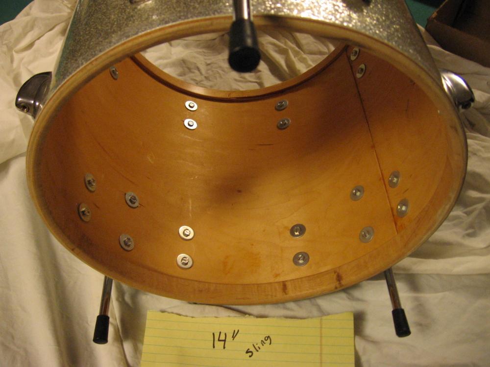 I picked this one up with hopes of having a nice true vintage kit to keep for a while, but a recent lawn mower failure is leaving me to prioritize a bit. The bass drum is the only one badged/grommeted. The tom and bass drum are labeled Jan 66, and the 14 floor is labeled Dec 65. The 12 has two extra holes where the diamond plate was repaired long ago. They would be hidden with a new one, but I know that drops the value a bit. The bass drum has one none original hoop, and 8 of the t's and claws are later year Slingerland. The floor is mostly untouched, and all of the muffler parts are there. there are a few spots on the chrome that aren't perfect, and the correct bass drum hoop is missing most of the inlay. I got these for a decent price, so if you would like to shoot me a PM I will entertain most offers. Sorry to not put up a price, but I did a little looking, and these have been all over the place for pricing recently. I prefer Paypal Only, lower 48 states only sales.