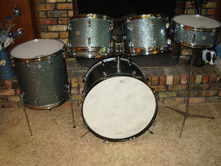 During the late 50's through the late 60's it was very common for drum sets to have two 8x12 toms. I have owned several of them. I bought some of them new in the 60's and some on the vintage market in recent years. I have also owned and played sets with two 9x13 toms. Here is a vintage Walberg and Auge set that I recently acquired. It has two 9x13 toms, and the badges both face forward with muffler knobs on the drummer's side.