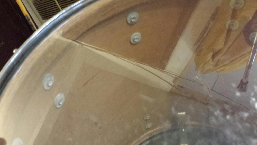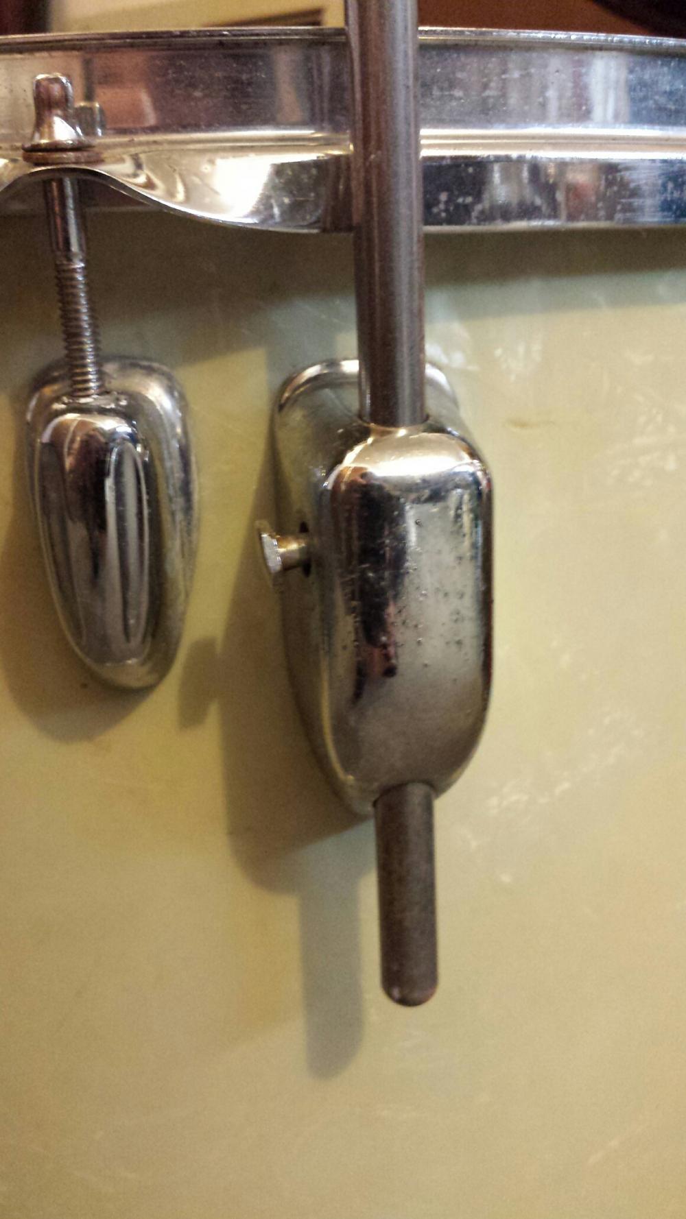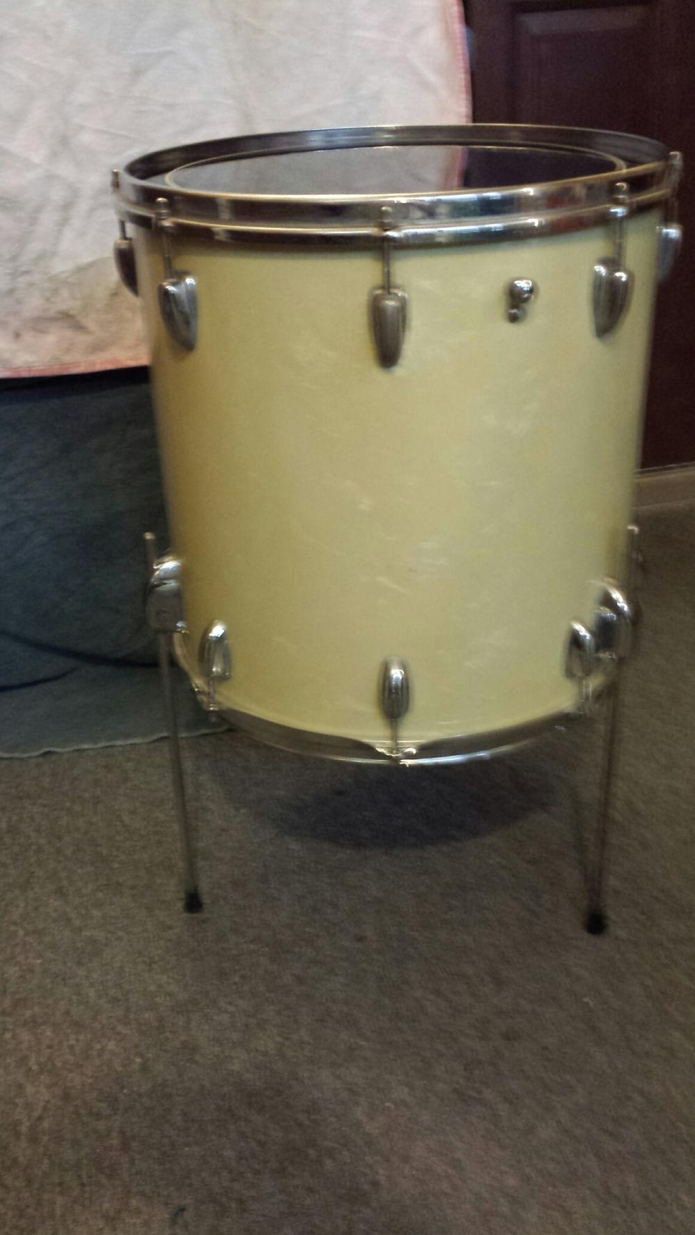 1966 Slingerland WMP 16" floor tom. This drum is in great shape. The wrap has yellowed through the years, but overall the drum is excellent. The top rim and tension rods are original, new rim and tension rods on the bottom. Has the original straight floor tom legs and push button leg brackets. One is missing the button but otherwise complete. Stamp date is visible inside the shell. - SOLD -