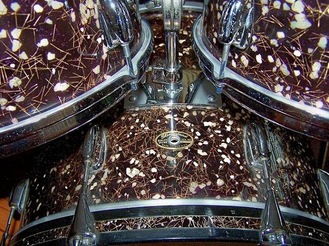 Thought I'd post a few pics of my newly acquired Slingys. These are some beautiful drums, in remarkably great condition. Mahogany interiors, 12-12-16-20 configuration, pre "3 dot" AZ cymbals (16" HHs!), all original hardware.