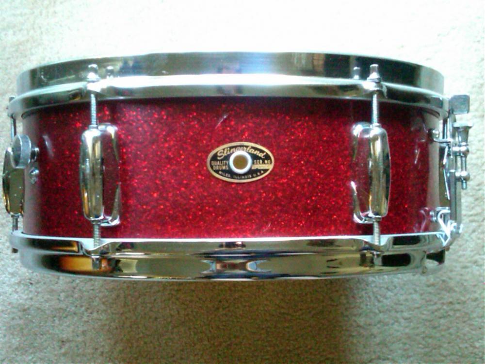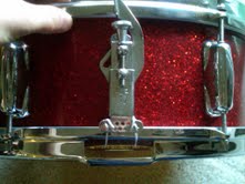 I Found this guy on Craigslist for a massive $50.00!! I gently cleaned it up and replaced the the beat up heads and generic snare wires with some Aquarian American Vintage heads (which I've never tried before) and some Puresound Custom Snare wires. The drum sounds great, I felt like the Aquarians were a good change up from my regular Remos due to the FAT bearing edges on this baby and I'm loving the combo. Everything appeared original other than the heads and wires with the one exception being the original Slingerland Strainer that came with this model was replaced with a chrome WFL P-83 strainer which works just fine with this drum and thankfully did not require new holes to install. Ideally, I would like to have the correct strainer that came with the Deluxe Student Model so if anyone that wants to trade a Slingerland strainer for a more desirable WFL P-83 let me know we can do a straight up swap and hopefully we will BOTH up with 2 more historically accurate snares! Kiss Other than that issue I am very happy to add another 6 lugger to my arsenal, I know I have expressed my love for the 6 lug student models in previous posts and this one is no exception. There is an open woody tone that you just can't get from drums with more lugs. This drum will complete my collection from the big 4: I have the Gretsch Dixieland in WMP, Ludwig Pioneer Transition badge in blue/silver Duco, Rogers Luxor in Blue Sparkle that matchs my Dayton era Tower kit and now this baby! I'm also a BIG fan of my B/O pointy badge Acrolite which was marketed as a student model as well but still seems to get more use than my Supraphonic which has been gathering dust since I picked up the Acro. Anyhow, moral of the story: Keep watching CL guys there's gold in them there hills!!!!:D