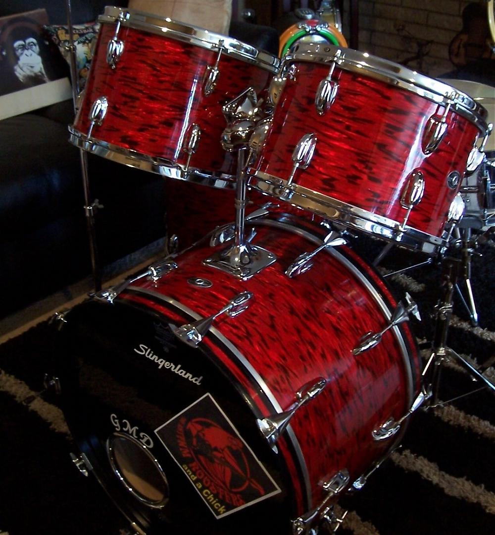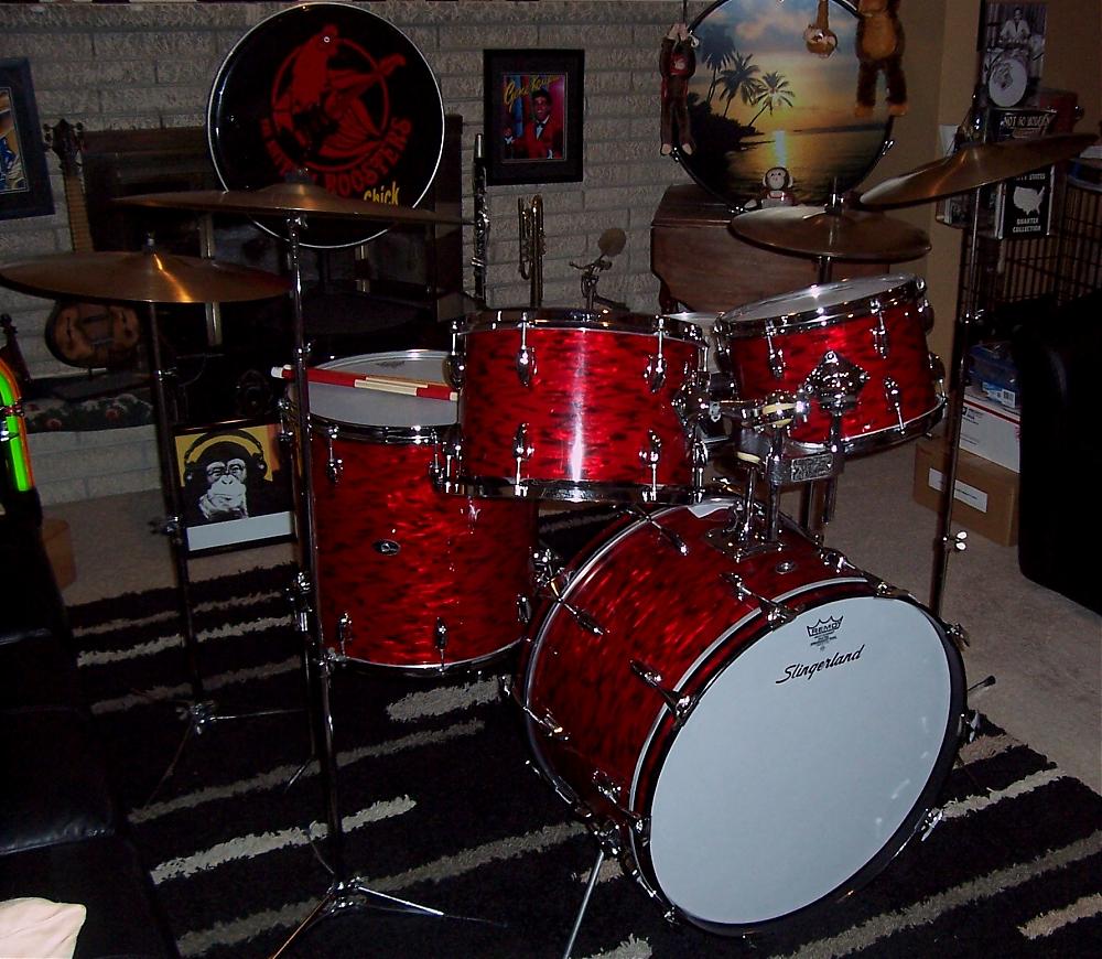 Hey dudes!So I am buying this Slingerland kit in Red Tiger Pearl. I know its not the most desirable finish, and even though it is technically "rare-ish" compared to any solid sparkle or pearl kit etc, people aren't that into it. All that is fine with me. This kit is in killer condition and when I clean it up it is gonna look like new! Im stoked.My question is this: According the Slingerland book, the finish was made from 1970 to 1973. This kit has gold and black niles badges, and they are all in the 224xxx range. That puts it late 60's (ish) by my count. I hear that the catalogues started showing the finish in 68...so why would the book say 70-73 only? This is obviously an earlier one. Was it just an oversight on Rob's part at the time? Seems like 68-73 would make more sense.Sizes are 20/12/13/16 w/ original Krupa snare.The kit has the earlier plain aluminum? set-o-matic mount, and looks to be original all over. No holes, minor pitting, all the parts are there, the wrap is in KILLER shape. The only thing it is missing is the inlay on the front bass drum hoop as well as the Ts and claws (older Gretsch style Ts).SO, I just wanted to share this with everyone and get anyone's comments on it. I am paying what I think is a very fair price for it, and it comes with some extra Slingy hardware...spur and floor tom leg mounts (which is nice). I will need to locate a hoop however. Ill post in the Wanted section, but for now...does anyone care to comment on the years this finish was actually produced? Let me see pics of your RTP kits! Im stoked on them! Kevins, VM2K, Im looking at you guys!Thanks!Adam