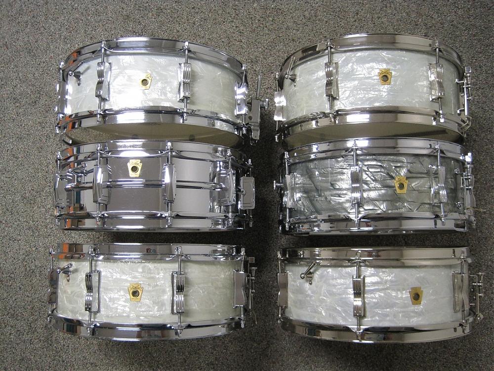top to bottom, left to right: leedy utility; ludwig 13" bronze piccalo; rogers dayton powertone; ludwig pioneer; ayotte keplinger; 1980 ludwig supersensitive; 66 supra; 6 ply 4 x 14 ayotte; 18-ply 5.5 x 14 ayotte; jr robinson "nail" drum; gadd birch signature snare; 50's super gk radio king; gretsch (forgot the year); 59 slingerland; chicago badge 15" slingerland; 40's wfl zephyr lug;