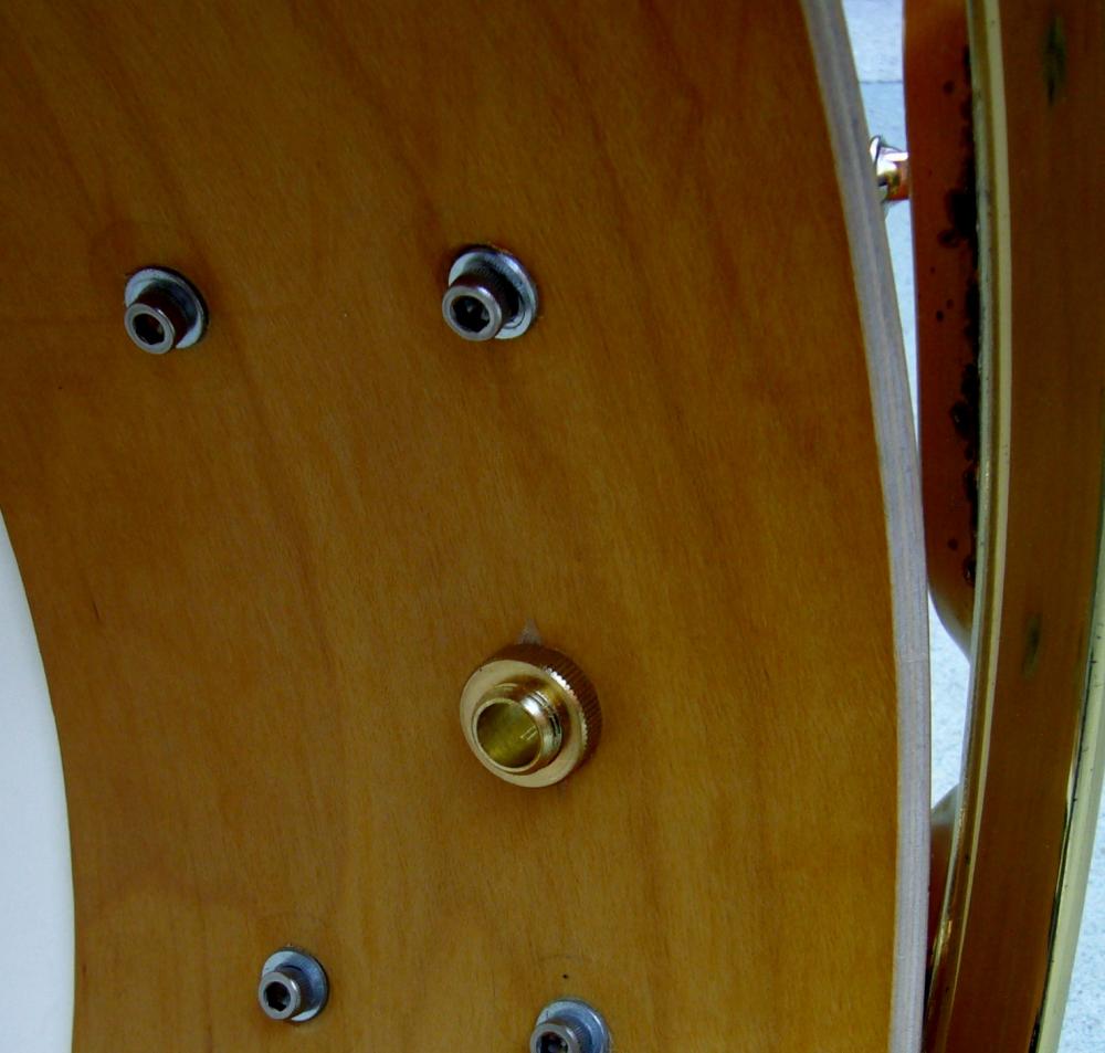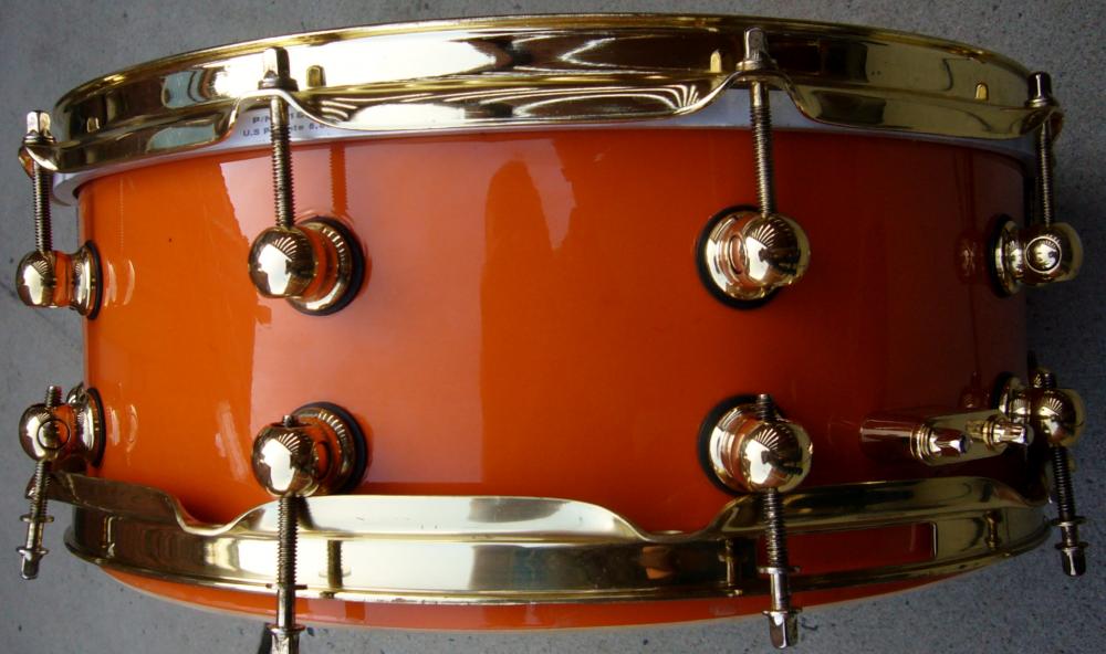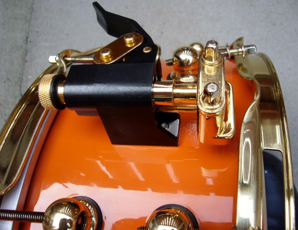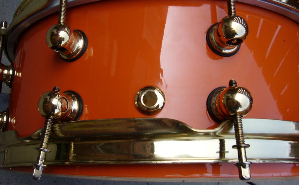 [FONT="Arial Black"][/FONT]This snare drum i got from the local tip. A friend of mine who works there rescued it rang me and here it is. Ive cleaned it up. The snare head batter head and wires were missing. I put an aquarian on the drum just need to get the rest. The finish came up great inside and out. As for the lugs and strainer ive never seem them before. The hoops were on the shell no heads with tension rods holding them in place. There is no badge or marking.......sean