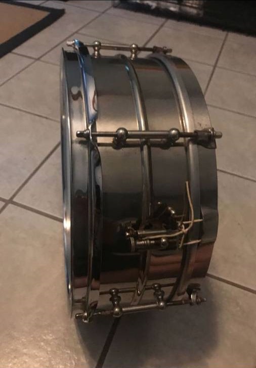 Obviously, has had the top rim replaced with what looks like a Ludwig rim (different plating and curved edge like my Ludwig's). I'm by no means an expert, just an old ****, but I'd guess MIJ seeing how the snares are attached.