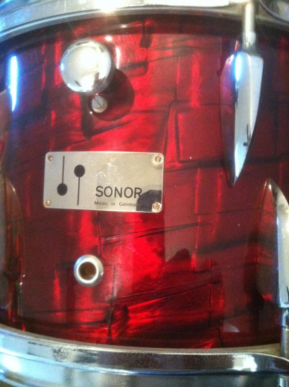 My name is Bob from NJ. I have 2 Sonor drums that I am having trouble identifying. They are both mounted toms. 1 is 8x12, the other is 8x13. I have attached a pic of the one drum. They are a matched pair. Hopefully someone can ID the year, model and color which is a candy red and black. The picture shows the badge plate with 2 mallets and says Made in Germany. Also shown are the tension lugs.