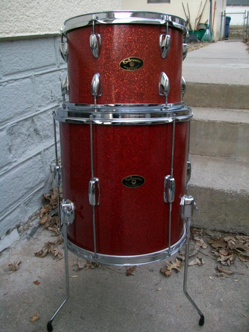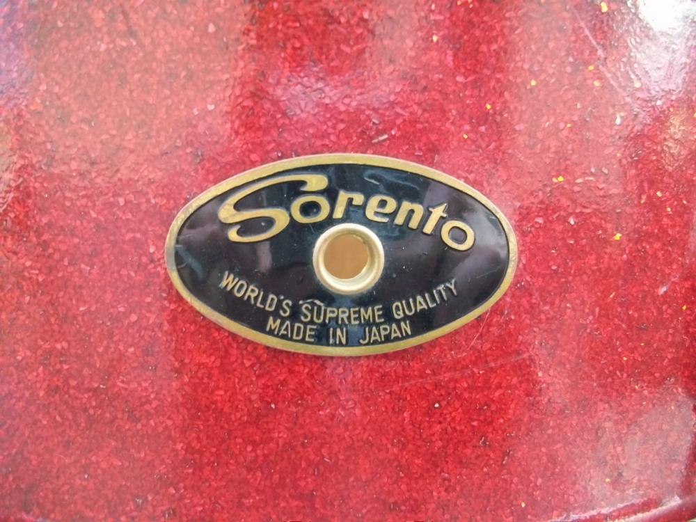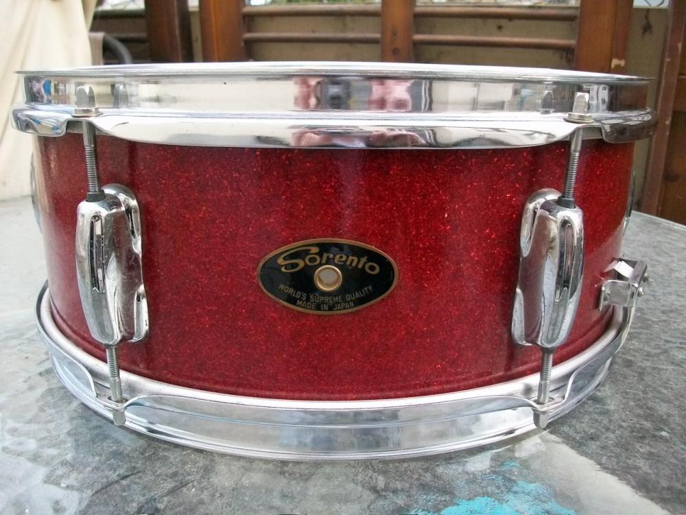 Let's see if there's any interest. I just picked these up a few weeks ago, cleaned them up and realized I have way too many drums. These are "Sorento" brand and appear (to me- correct me if I'm wrong...) to be Star brand from the early 70s. 20-12-14 with a matching snare, and ALL of them have six lugs/side. Grey-painted interiors on 8-9 ply wood, no re-rings. Red sparkle finish is in excellent shape; there's a scuff or two, but really very nice. A slight (and I mean slight) bit of sun-fade on one side of the snare and rack tom. The chrome is about as good as any I've seen on MIJ drums of this vintage. Yes, there's a touch of rust in the corners on hoops and a blister or two on the lugs, but overall pretty clean. Decent (playable) heads all around, but I'm not gonna pay to put anything new on them- that's up to you. Never pulled the hardware off, so a motivated owner could still get them prettier! ALL original lugs/hoops present. No other hardware beyond what you see.