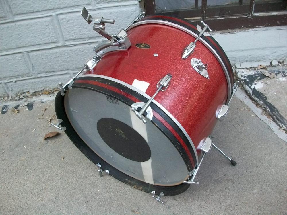 Now the negatives: The red sparkle inlay on each hoop only goes about 2/3 the way around. The bottom sides have nothing. Hardly noticeable unless you're looking, as the tops are covered. Also, these are the hoops that weigh about 2 oz each: must be made of balsa wood! But they're original and quite nice for what they are. The cymbal holder depends on some sort of 3/8 rod to be in it in order not to rattle... You will get nothing more than a cruddy 3/8 bolt in there, 'cause I didn't even get that. The picture shows a chrome piece protruding- ignore it. You won't get it. That's about it. Almost forgot- previous owner drilled an additional hole on top of the bass drum and swung the rail around topside; I returned it to it's original position and filled the hole with a chrome carriage bolt.