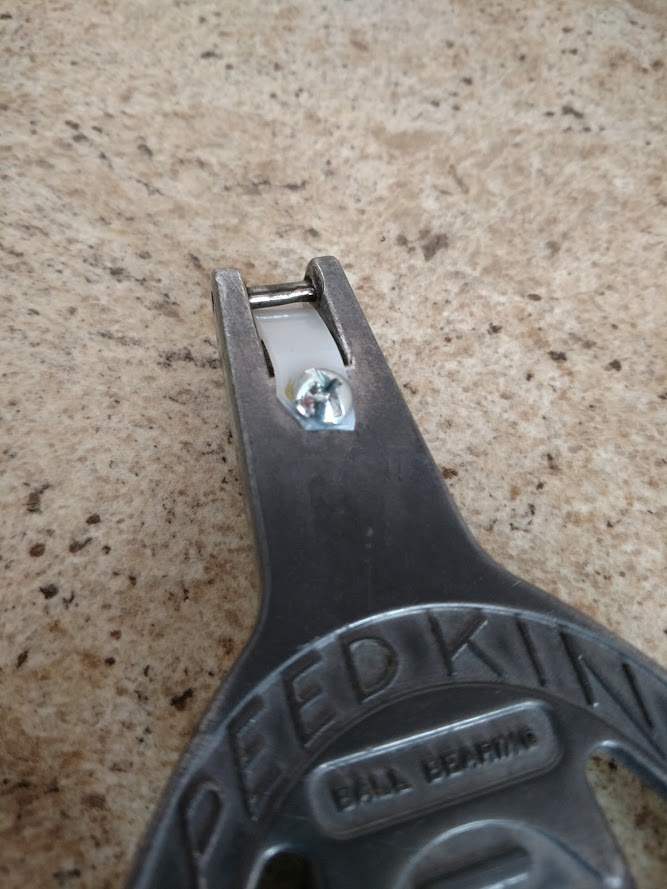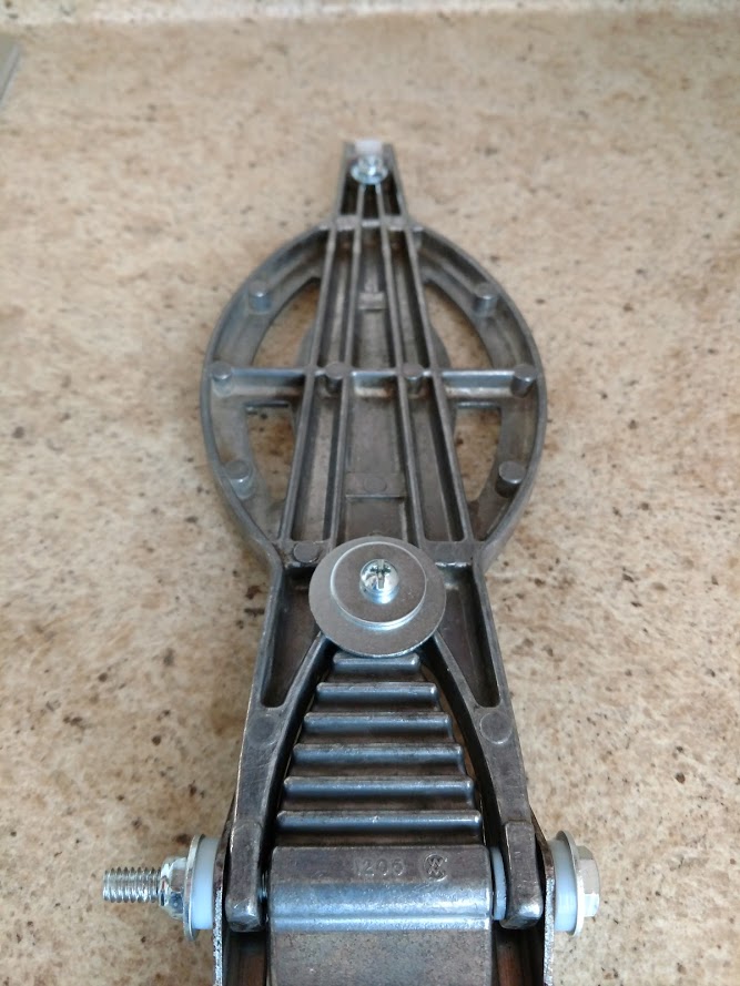Finally, the tension pin that was holding the hook onto the chassis was almost pulled through, and the hook itself was bent in a couple different places and was overall hanging crooked. I just ordered a whole new hook and pin assembly for about $ 8. In lieu of the pin, I used a small screw and nut, again with nylon washers so there was no metal to metal contact. The new replacement hook (and the original as well) has a small nylon sleeve that is hidden inside the hook (that the pin/screw) goes through. I didn't know that before!